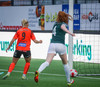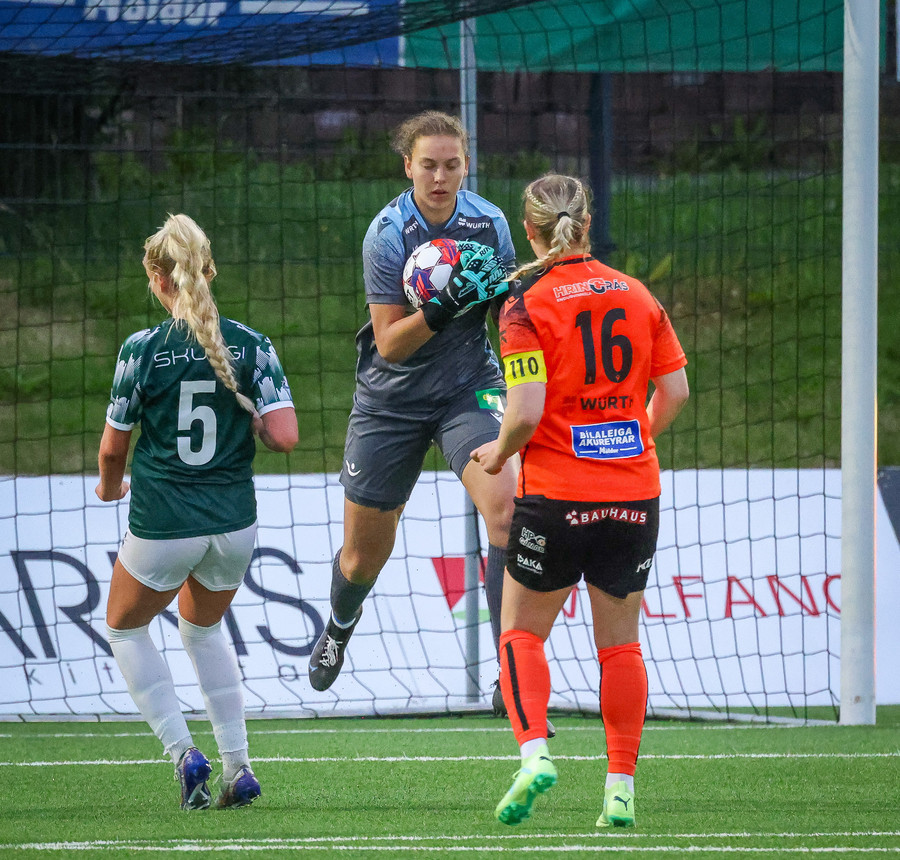 Viktoría með fínt hlaup reynir að finna Guðrúnu í gegn en boltinn aðeins of fastur og Eva handsamar hann.