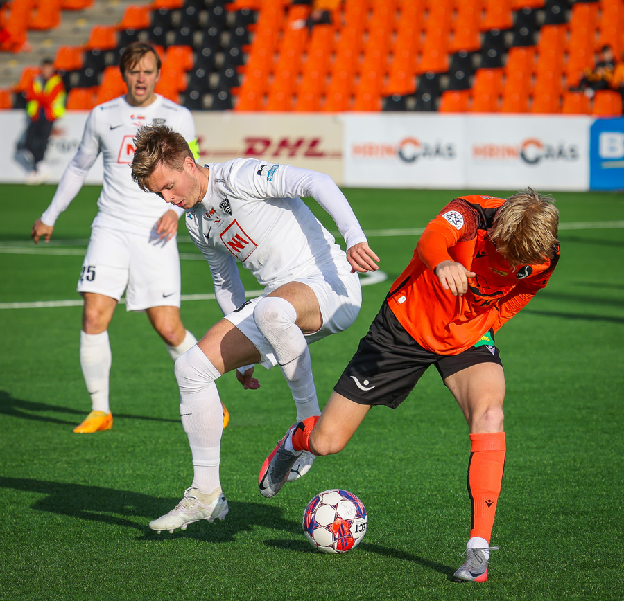Tómas Bent fær dæmt á sig brot hér miðsvæðis þegar hann fer harkalega í Nikulás Val.