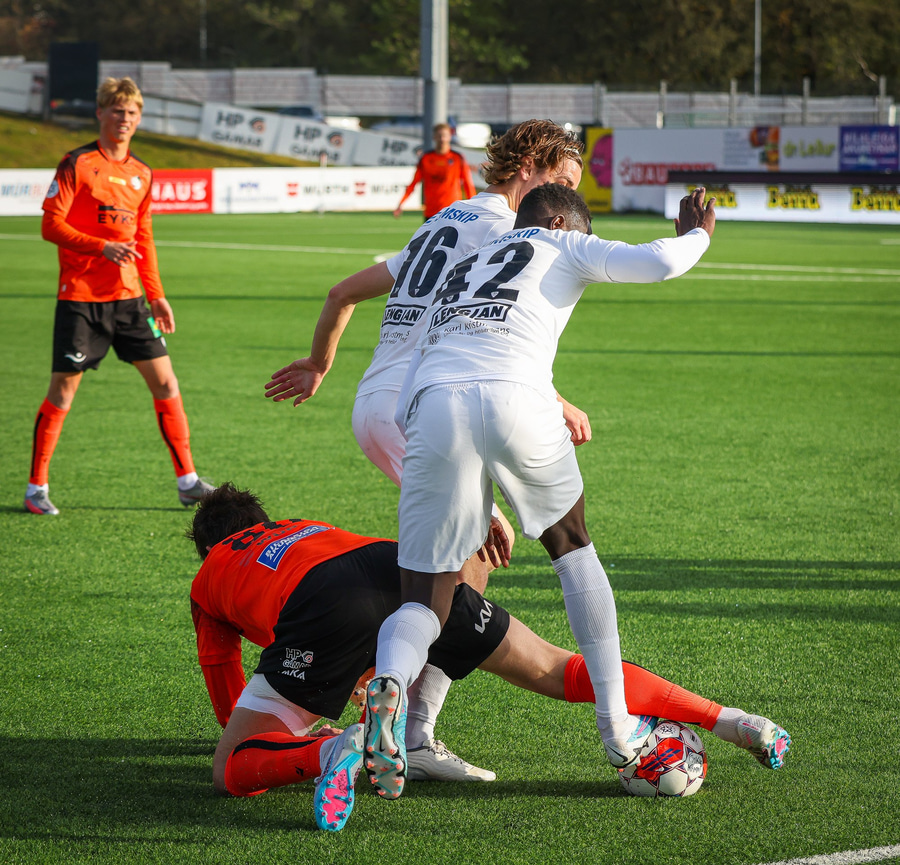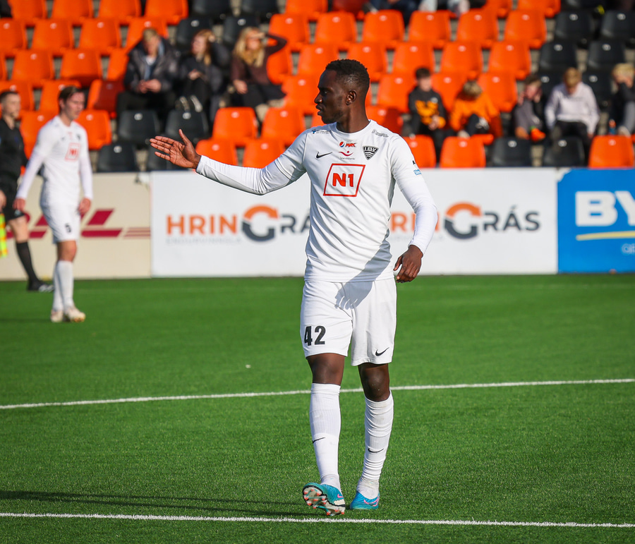 Benni ógnar hér vinstra megin í teignum, leitar inn á miðjan teiginn og gefur boltann á Nikulás. Hann reynir skot sem Guy ver út til Birkis sem á skot yfir markið.