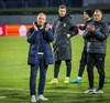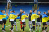 Leikmenn Zorya eru allir með Ukraínska fánann utan um sig.