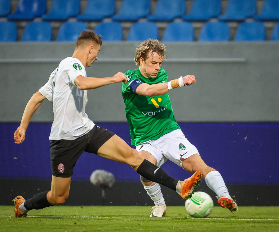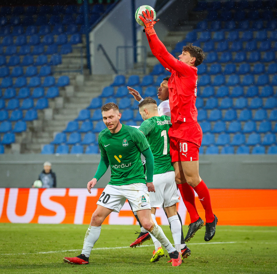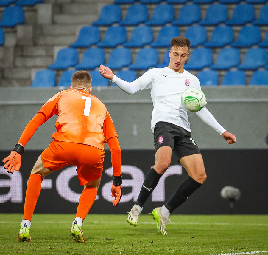 Gísli Eyjólfs með hörkuskot rétt fyrir utan teig sem Mykyta ver í marki Zorya.