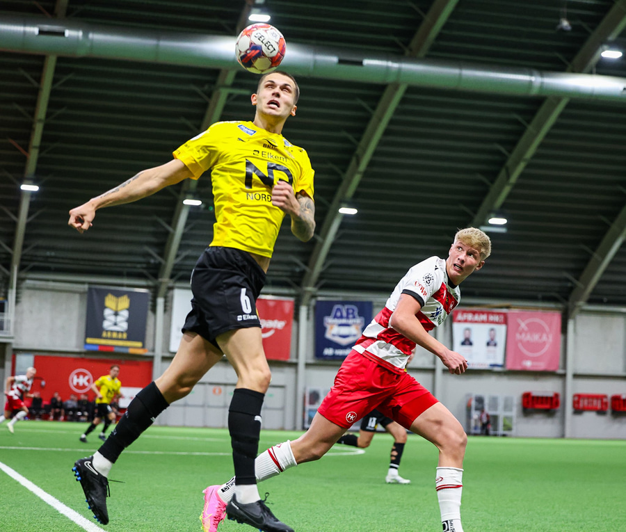 Fyrirgjöf frá vinstri frá Vall inn á miðjan teiginn þar sem Viktor ræðst á boltann og skallar í netið framhjá Arnari.