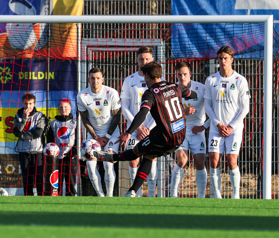 Karl Friðleifur tekur spyrnuna stutt á Djuric sem kemur honum fyrir markið. Boltinn á viðkomu í Damir og rétt framhjá marki Blika!