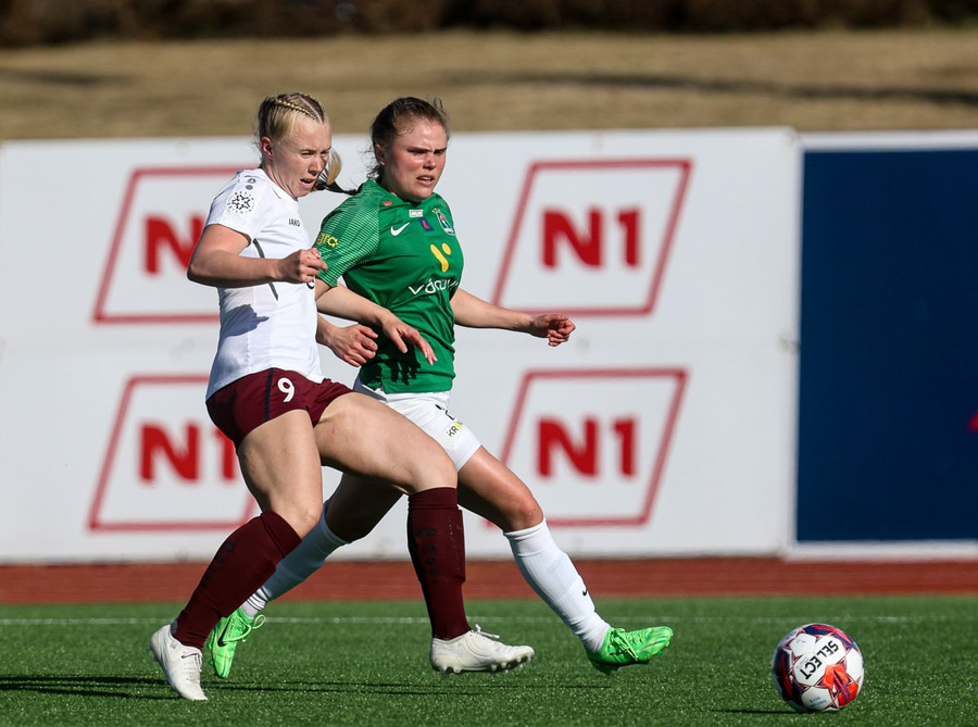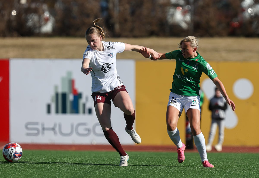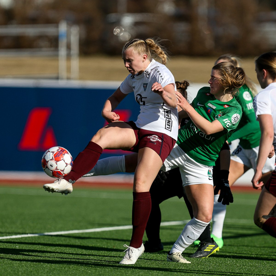 Áslaug Munda með geggjaða hornspyrnu og Anna Nurmi setur boltann í stöngina. Þarna átti hún að gera mun, mun betur.