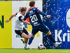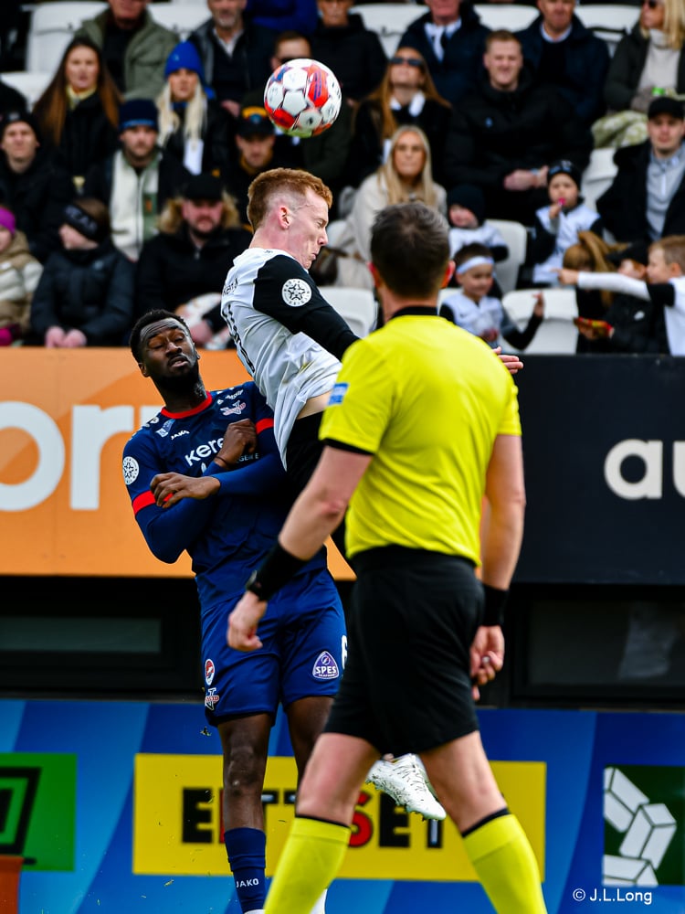 Langur bolti fram hjá FH og Kjartan Kári nær geggjaðri snertingu til að drepa boltan. William Eskelinen er hinsvegar fljótur út úr markinu og lokar á þetta.