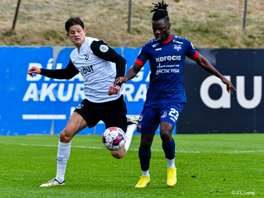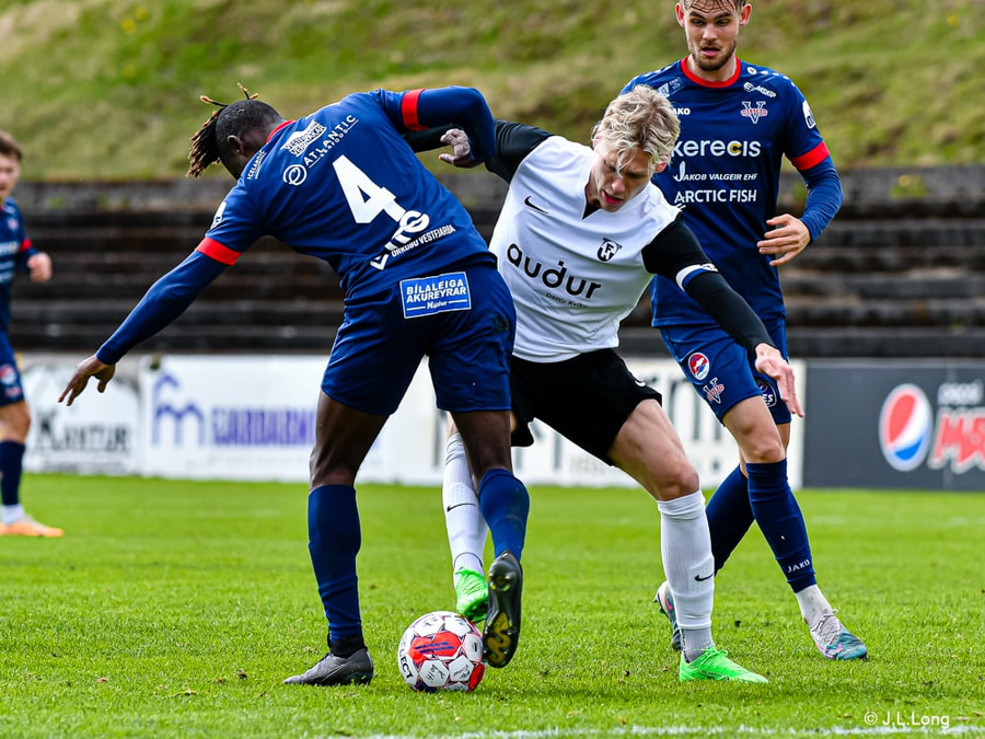 Þá fer þetta af stað og það eru Vestra menn sem hafa upphafssparkið.