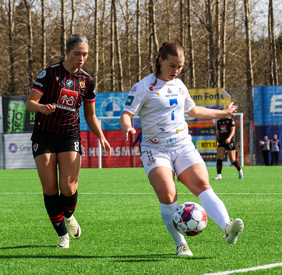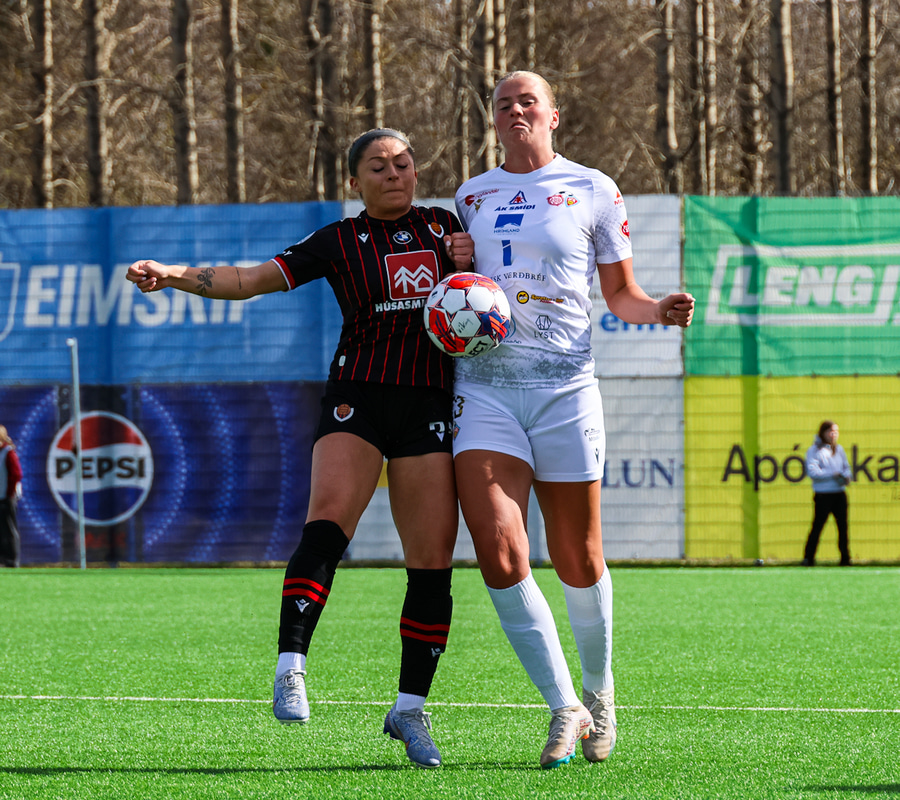 Álitleg sókn Akureyringa. Hulda Ósk með boltann í teignum, leggur hann fyrir markið en þar vantar bara samherja að ráðast á boltann. Víkingar hreinsa.