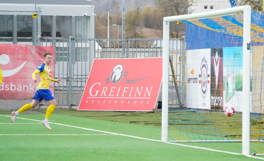 Sveinn Margeir sleppur einn í gegn eftir frábæra sendingu inn fyrir frá Ívari og setur boltann snyrtilega í netið.