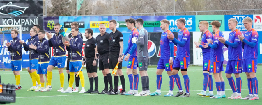 KA spilar í sínum heimabúningum, gul treyja og bláar stuttbuxur. Fylkir er í bláum búningum með Fylkis appelsínugulum í.