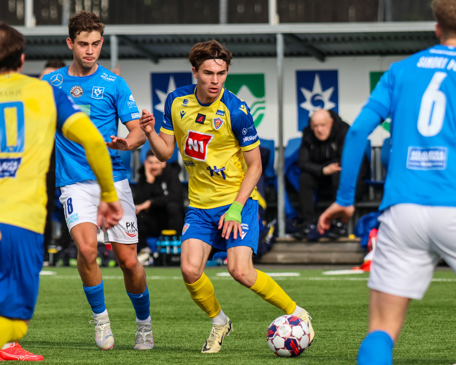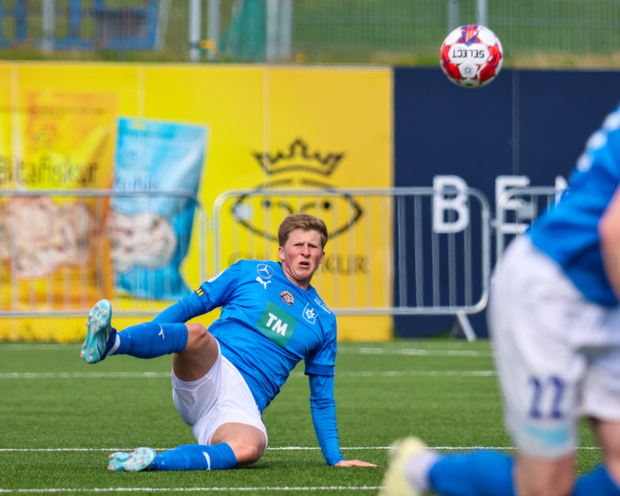 Óli Valur með flottan sprett upp kantinn í skyndisókn. Hann reynir sendingu fyrir en Hans kemst fyrir en boltinn fór næstum í eigið net. Rétt framhjá.