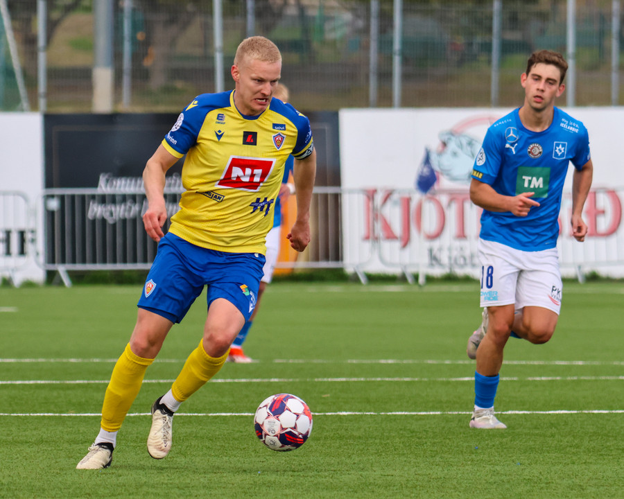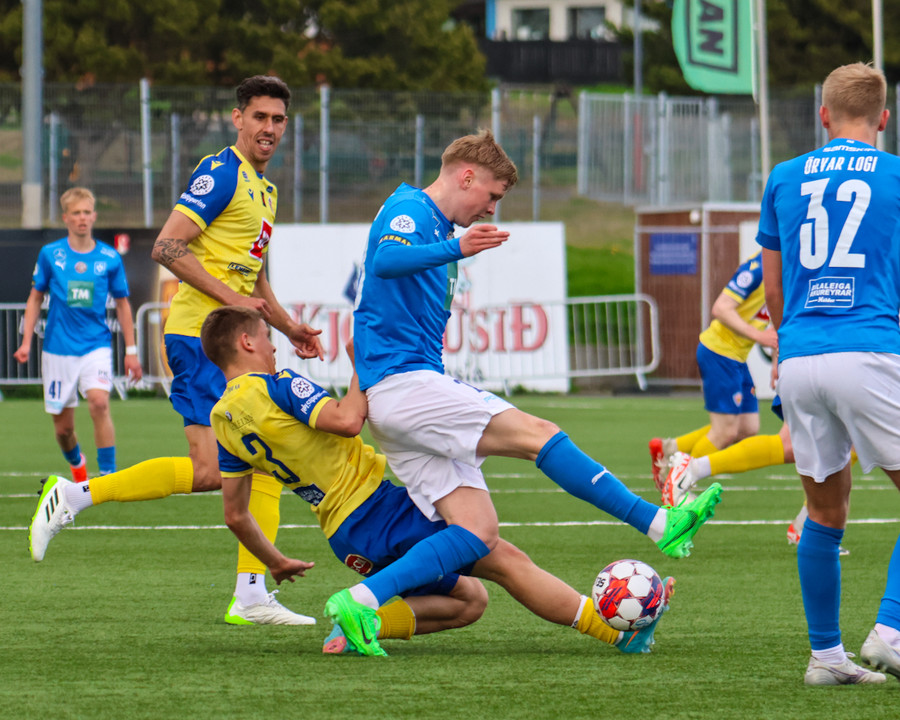 Daníel Hafsteinsson tapar boltanum á eigin vallarhelmingi og Jóhann Árni kemur með góðan bolta á Örvar. Hann er þá kominn inn í teig frá vinstri kanti og leggur boltan í fjærhornið.