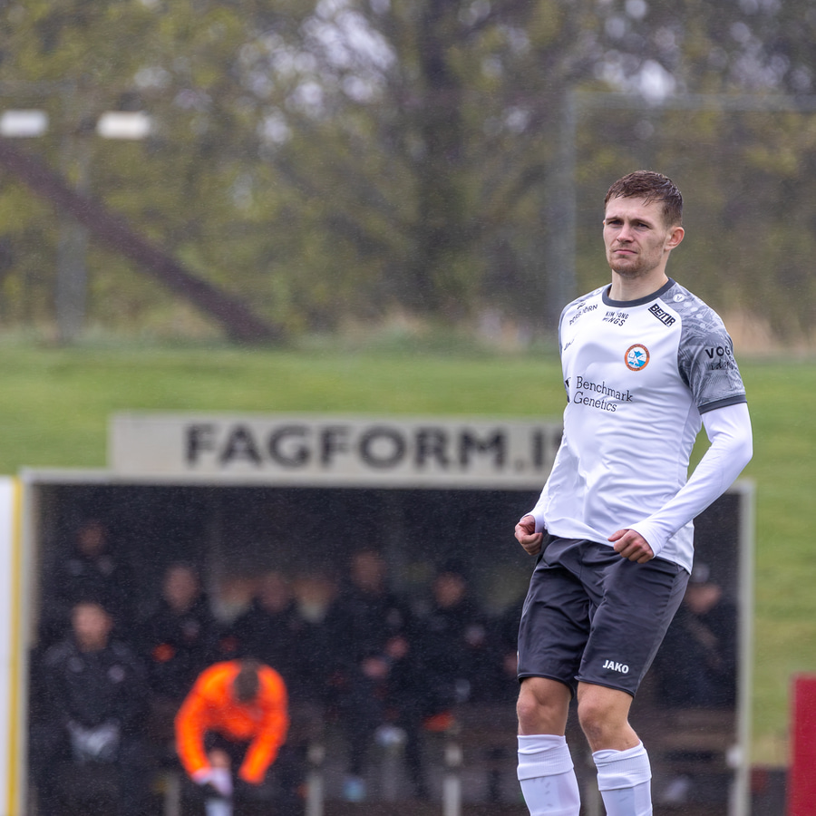 Boltinn rennur þægilega til Jóns sem lætur vaða af löngu færi og hann smell hittir boltann en Benjamín ver frábærlega