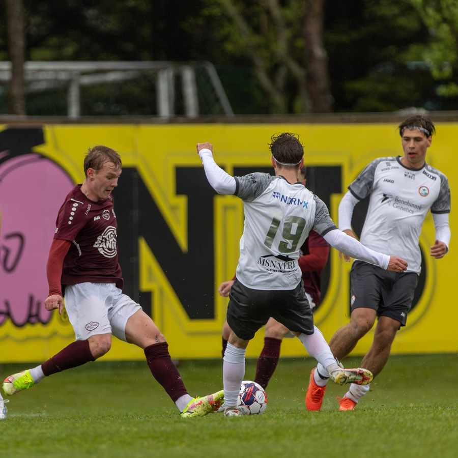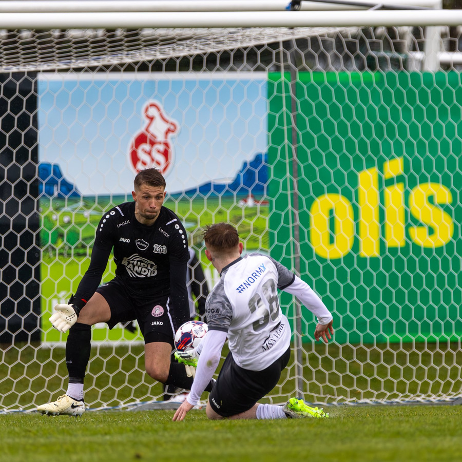 Langur bolti á hægri kanntinn sem Ívan tekur meistaralega á móti og köttar inná vinstri og á skot sem fer í varnarmann og Aron er vel vakandi og táar boltannn inn