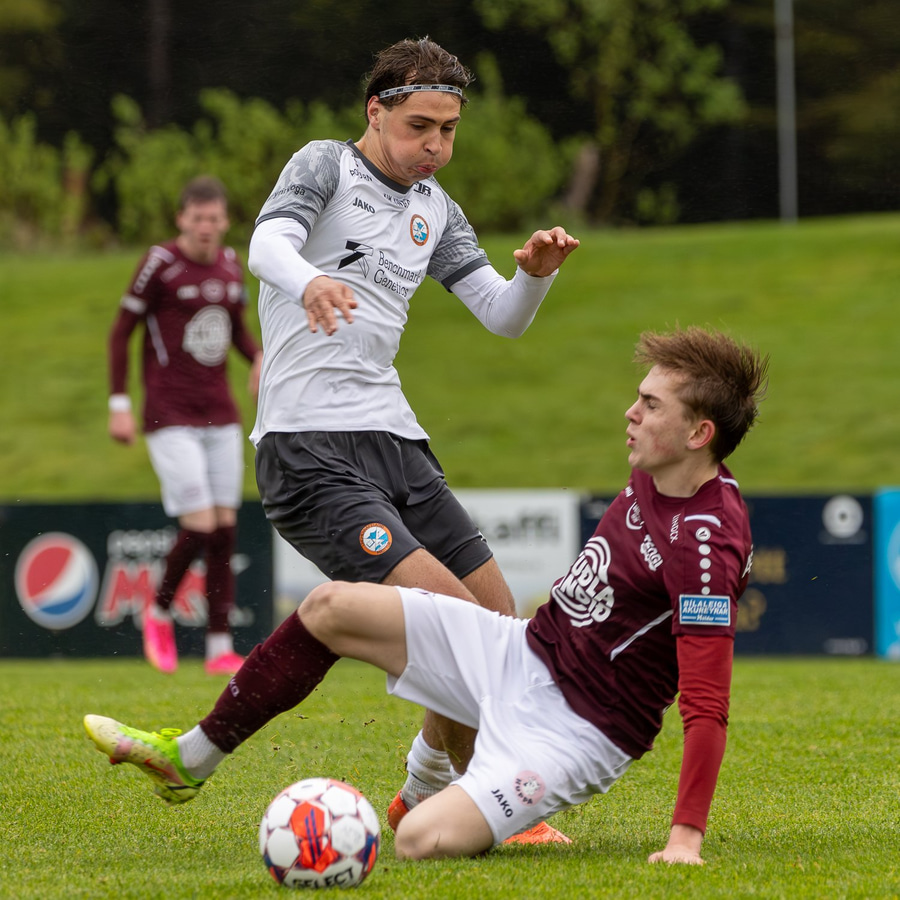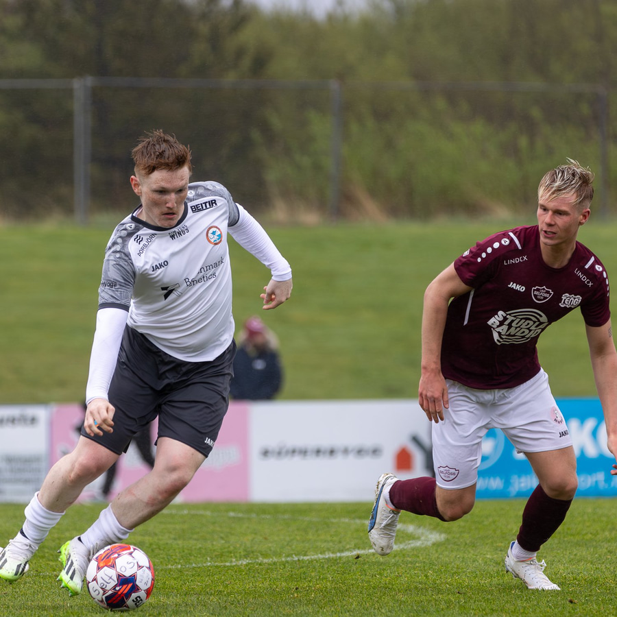 Aron Fannar með sendingu inná teiginn sem Breki nær aðeins snertingu á en hann skoppar til Benjamín