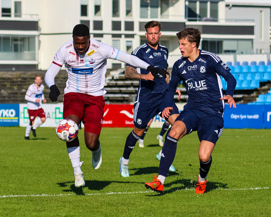 Omar Sowe og Róbert Hauksson leika vel sín á milli. Róbert kemst inn á teiginn og reynir að leggja boltann fyrir markið en varnarmenn komast fyrir og gefa horn.