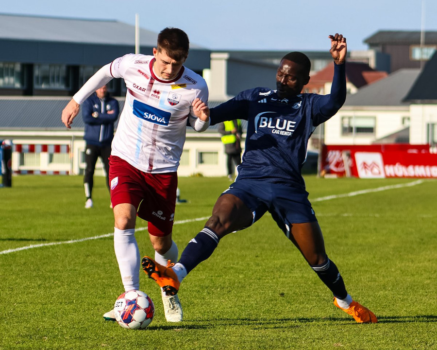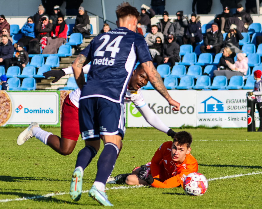 Frábært samspil Omar Sowe og Shkeizen við teig Keflavíkur leiðir af sér færi fyrir Þorstein Emil. Hann er einn gegn Ásgeir Orra sem mætir honum vel og lokar á skotið.