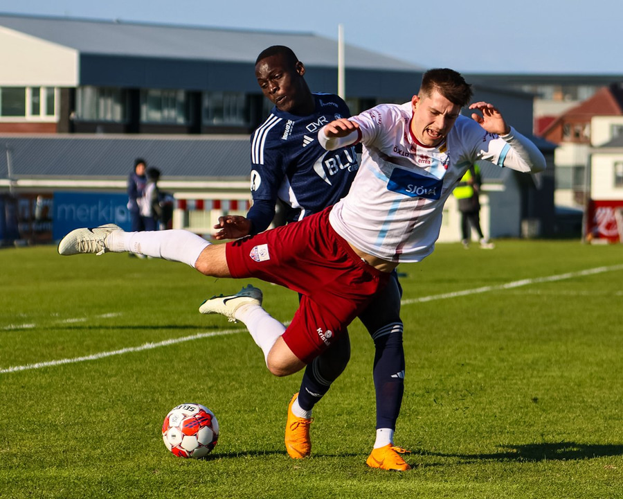Viktor Freyr of seinn út úr marki sínu og brýtur á Mamadou