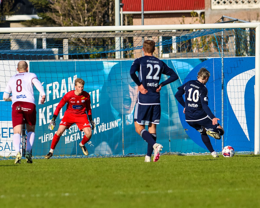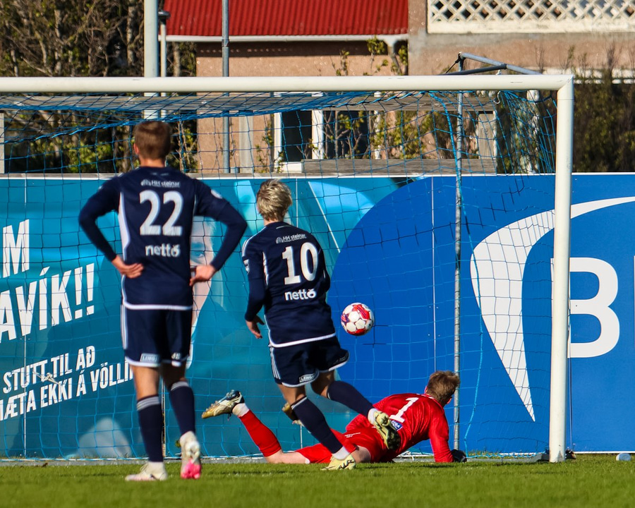 Viktor í rétt horn en spyrna Dags öruggt og í erfiðri hæð fyrir Viktor og endar í netinu.