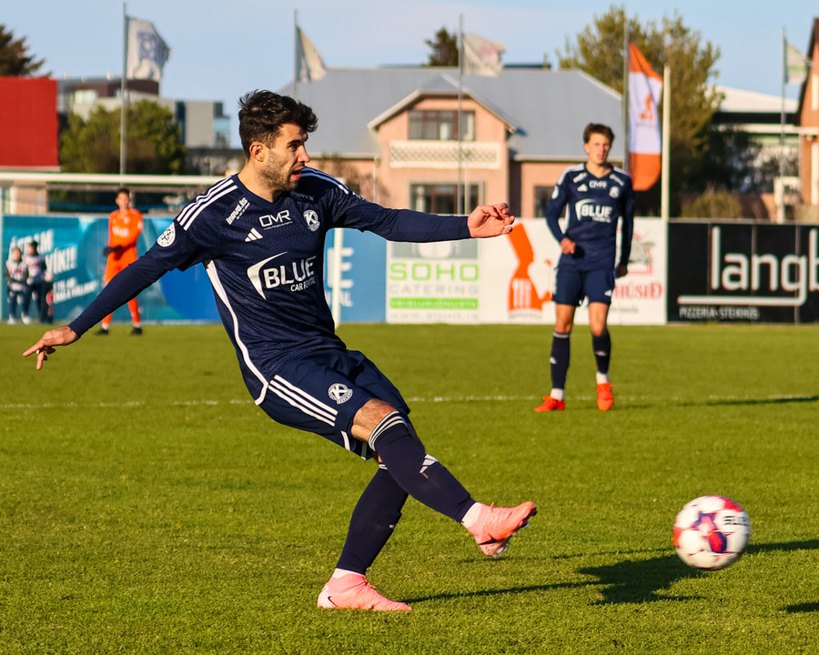 Róbert Quental með spyrnuna en setur boltann talsvert fjarri markinu.