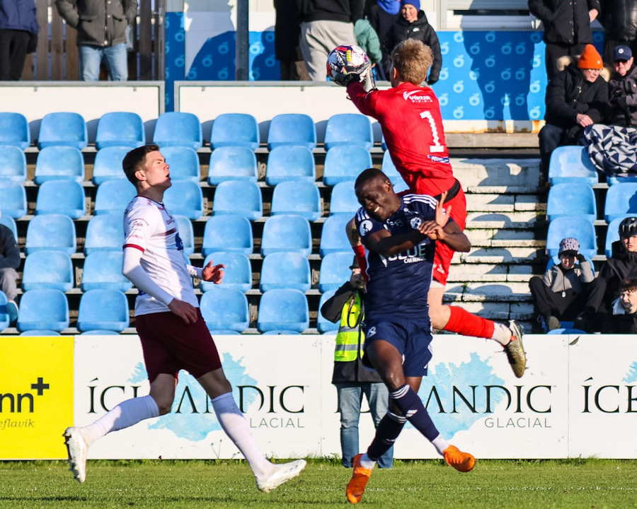 Eftir hornspyrnu féll boltinn fyrir Patryk í markteig Keflavíkur. Hann lætur vaða á nærstöngina en Ásgeir Orri ver á ótrúlegan hátt. Skellir sér klofvega á stöngina og finnur vel fyrir því en ver boltann í leiðinni.