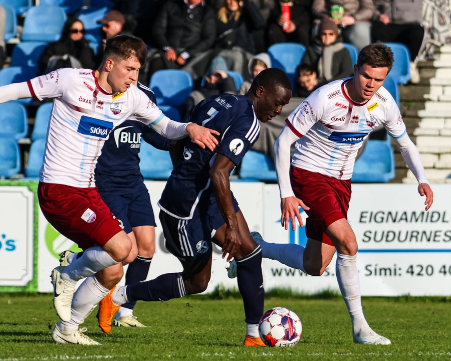 Omar Sowe með boltann í fætur í teig Keflavíkur en nær ekki að koma skoti á markið.