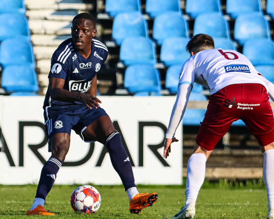 Omar Sowe með skot að marki úr aukaspyrnu af um 25 metra færi. Kemur boltanum framhjá veggnum og á markið en Ásgeir Orri ver.