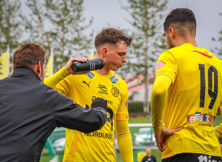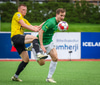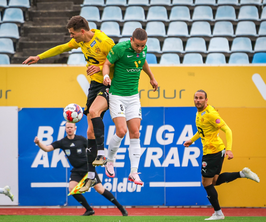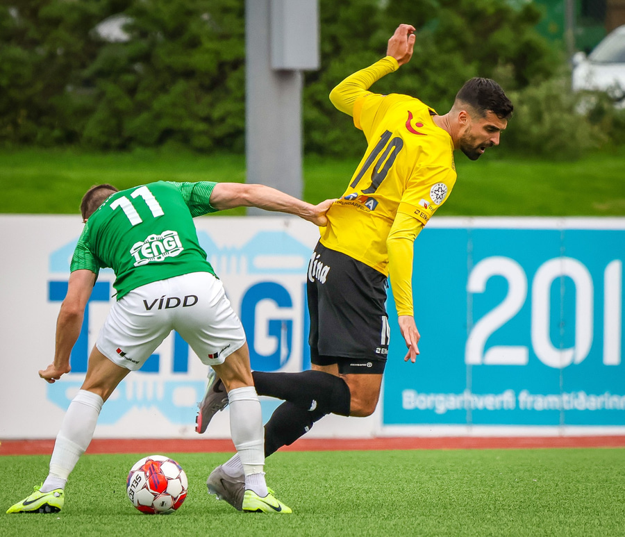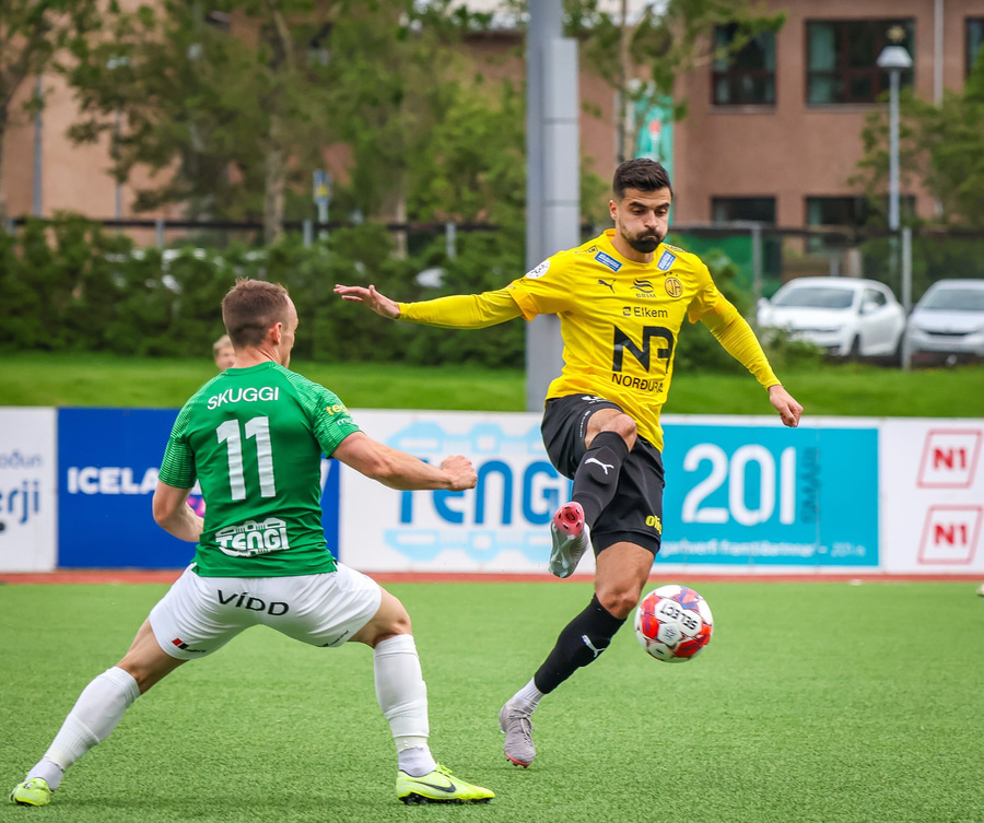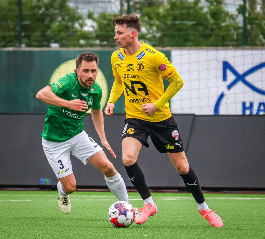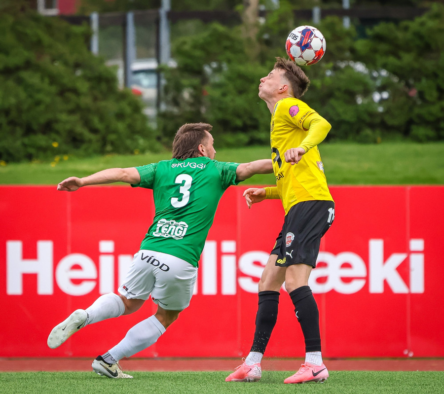 Aron Bjarna vinnur boltann og keyrir upp völlinn. Hann rennir boltanum til hliðar á Viktor Karl sem kemur honum þá fljótlega á Jason Daða. Jason er þá komin í ágætis skotstöðu en skotið hans fer hátt yfir markið.