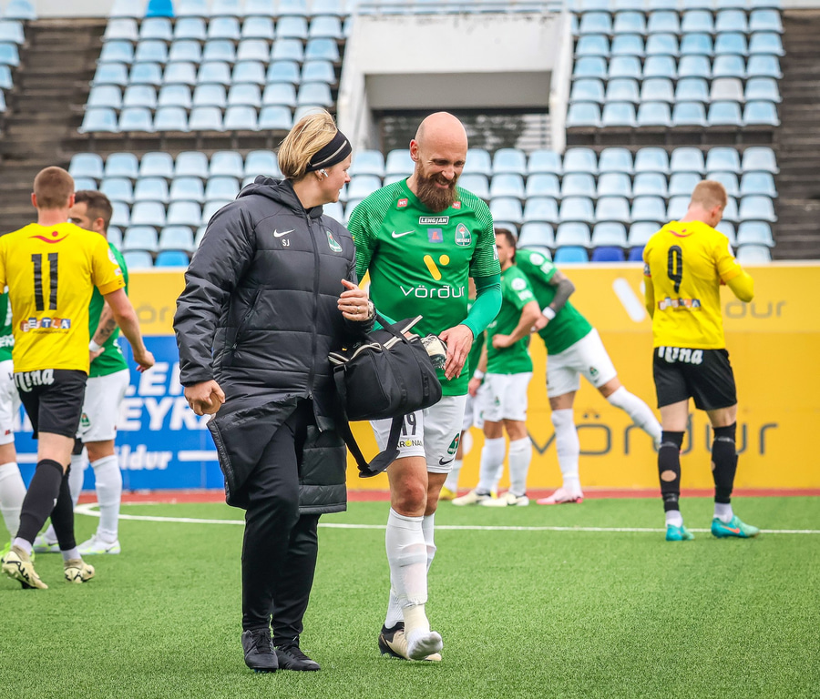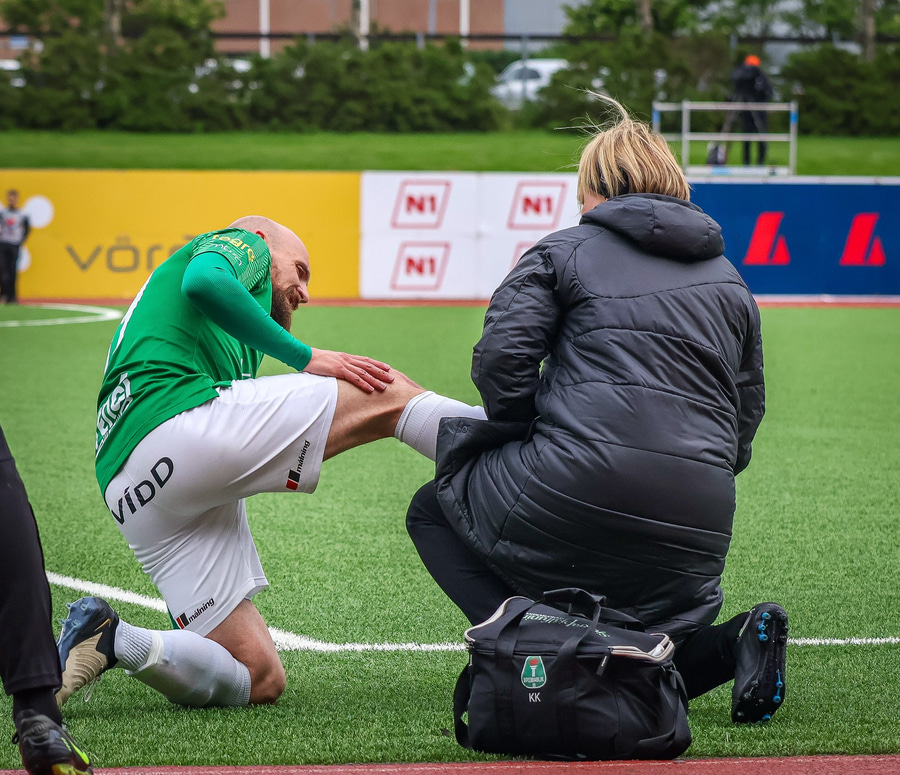 Kiddi mættur aftur inn á völlinn. Þurfti að fara af velli í smá stund og úr skónum.