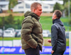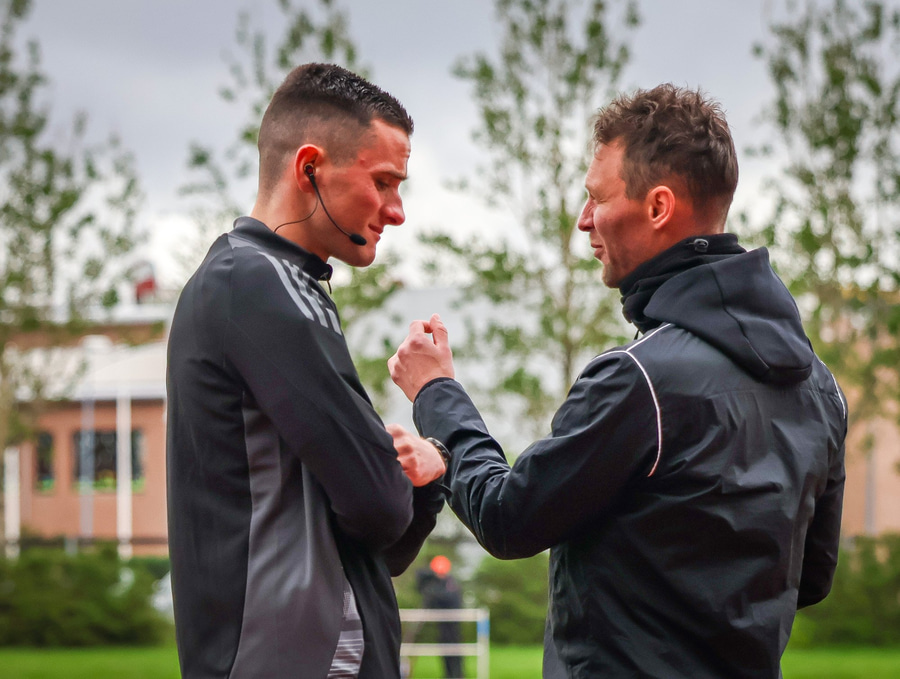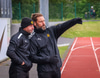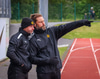 Dóri virðist hafa séð þetta aftur á bekknum og hleypur að Gunnari Oddi, fjórða dómara, og kvartar.