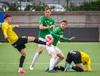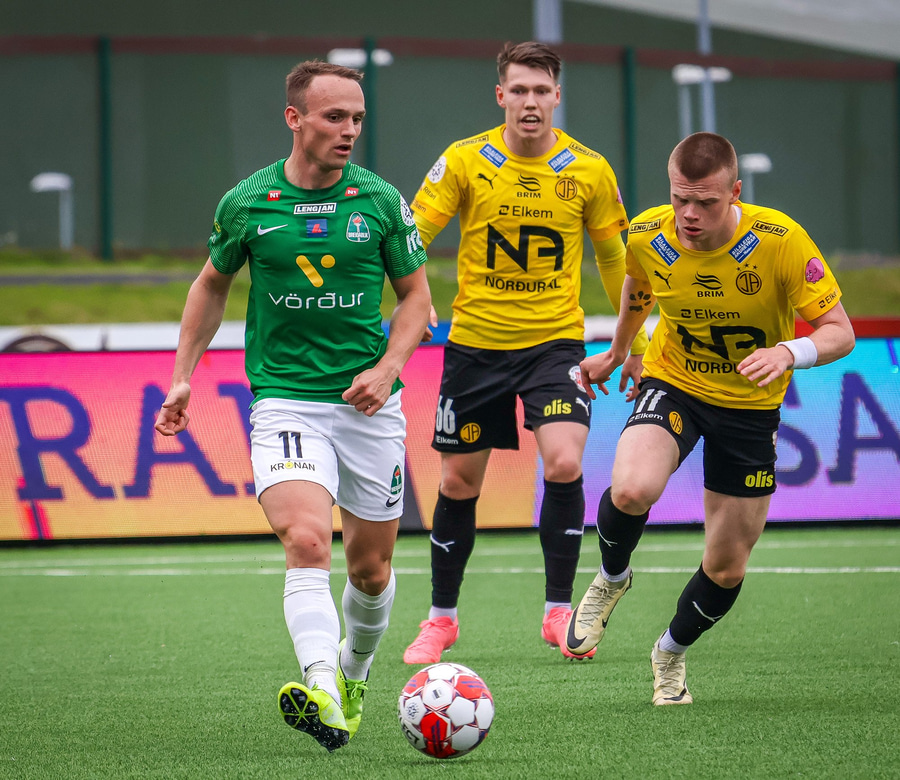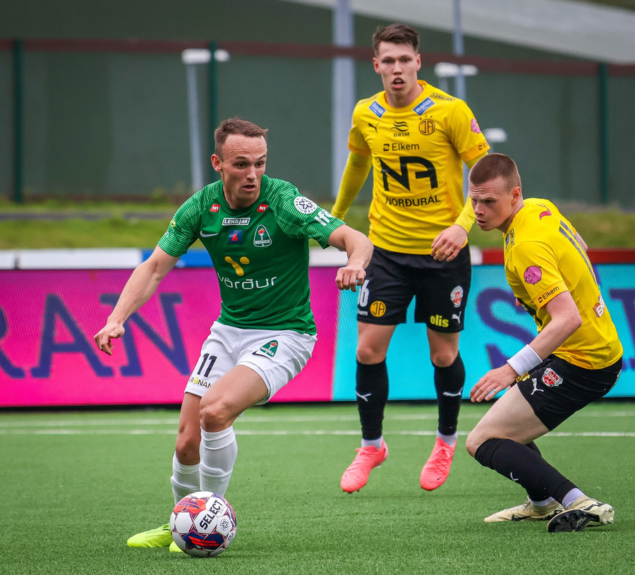 Jón Gísli fær boltann og keyrir inn á teig. Hann er með Hinrik og Viktor sér við hlið en ákveður að taka sjálfur skotið sem fór beint á Anton Ara í markinu.