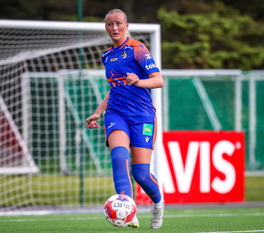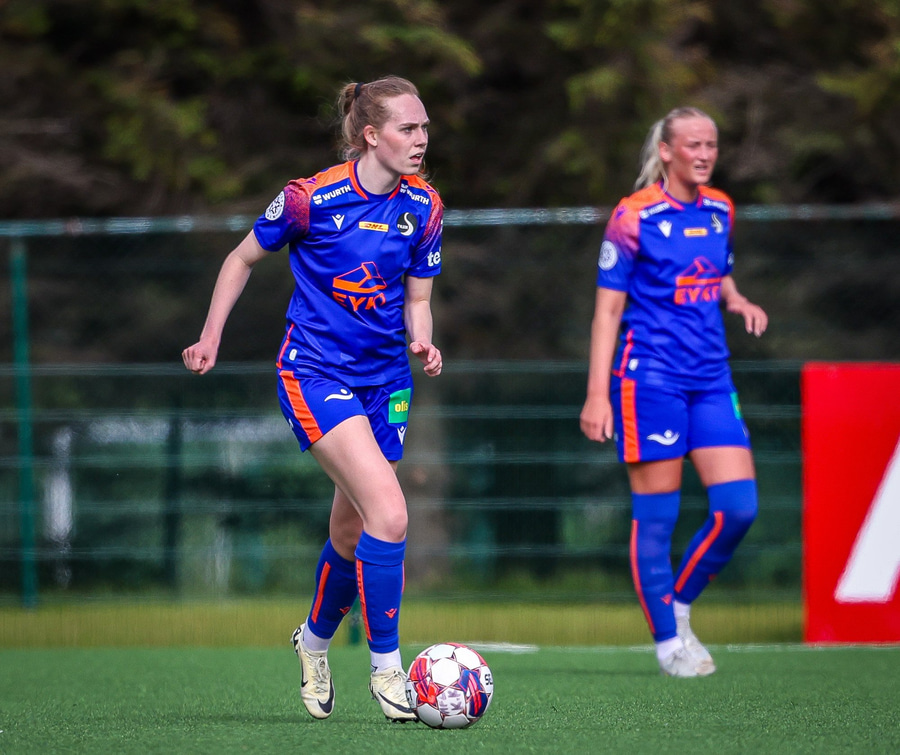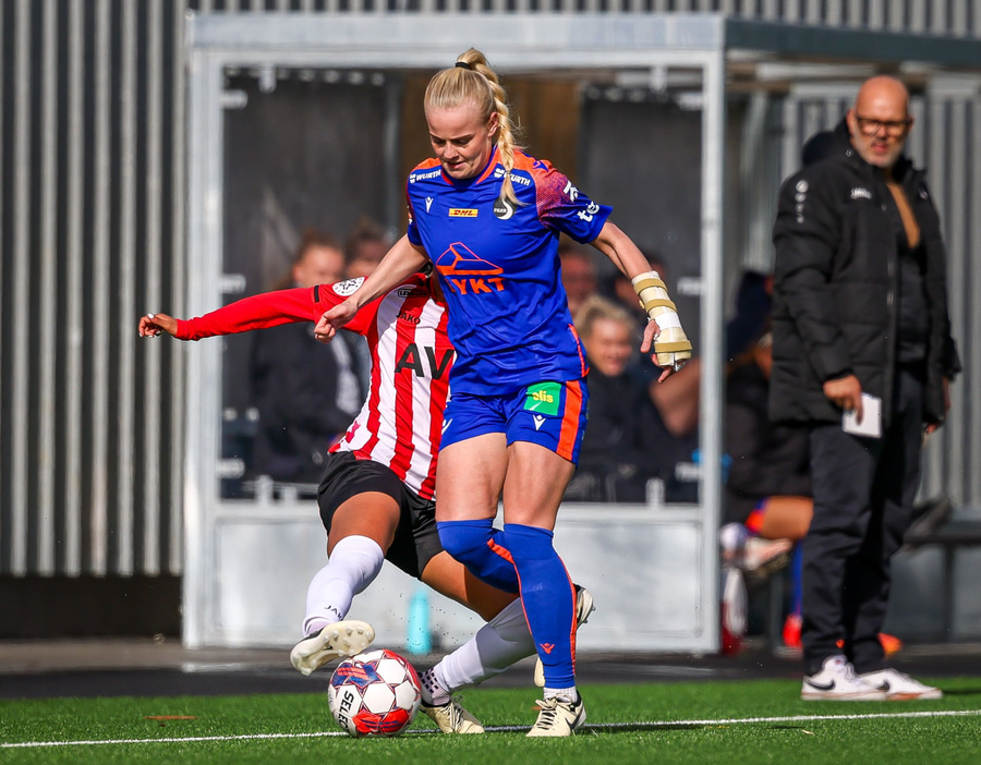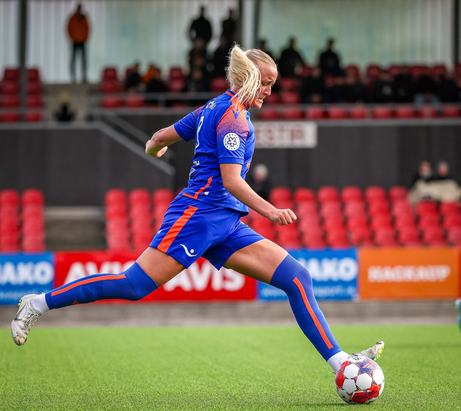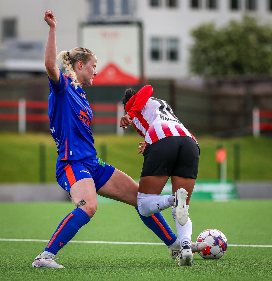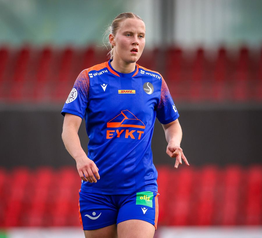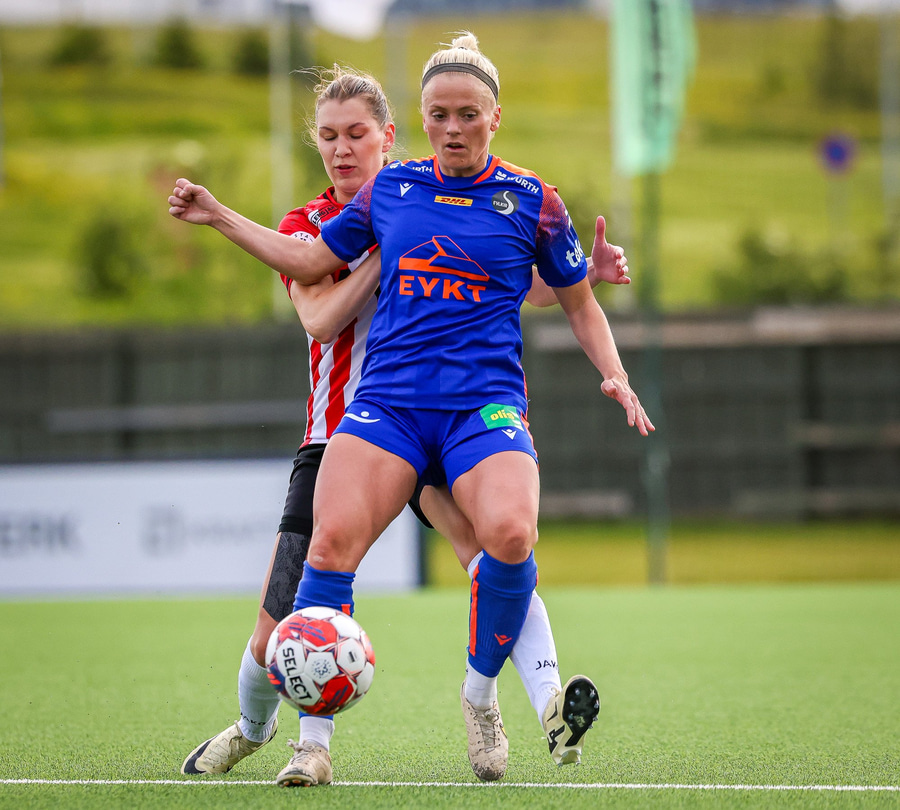 Þórhildur með glæsilegan sprett upp völlinn og kemur boltanum svo út á Evu. Eva er í góðri stöðu inn á teignum og lætur vaða nema skotið fór í hliðarnetið.