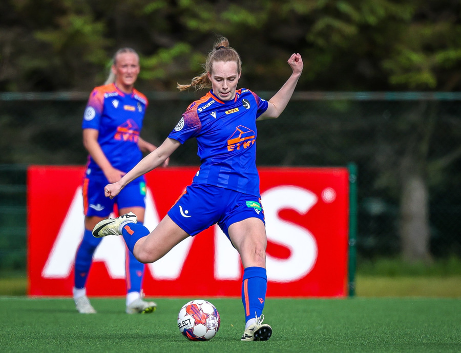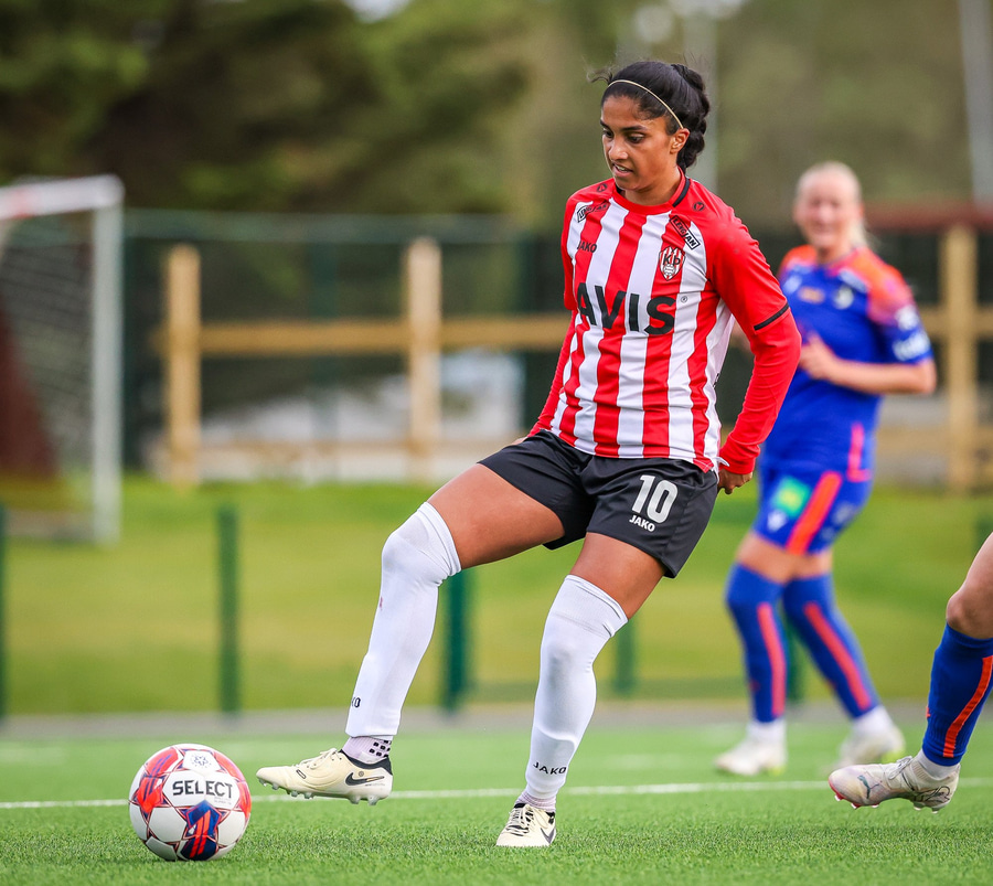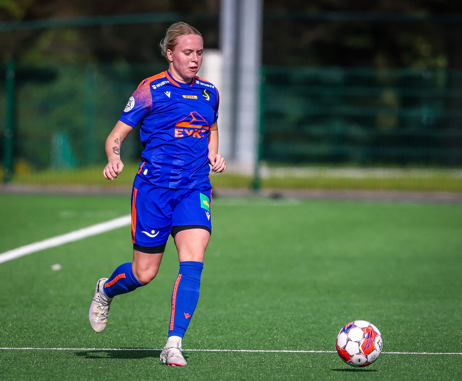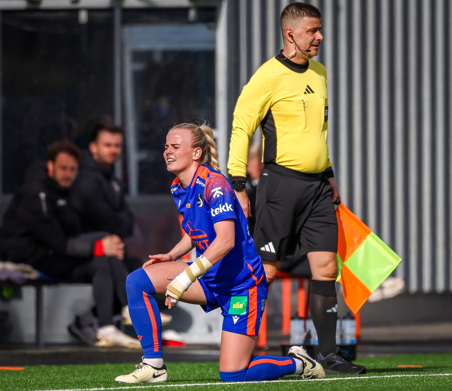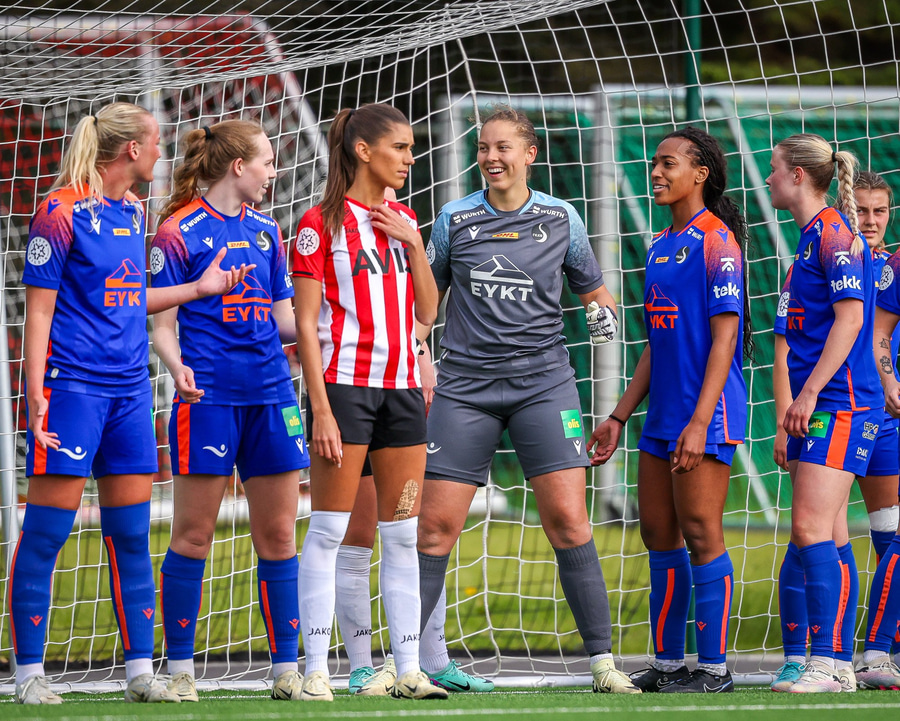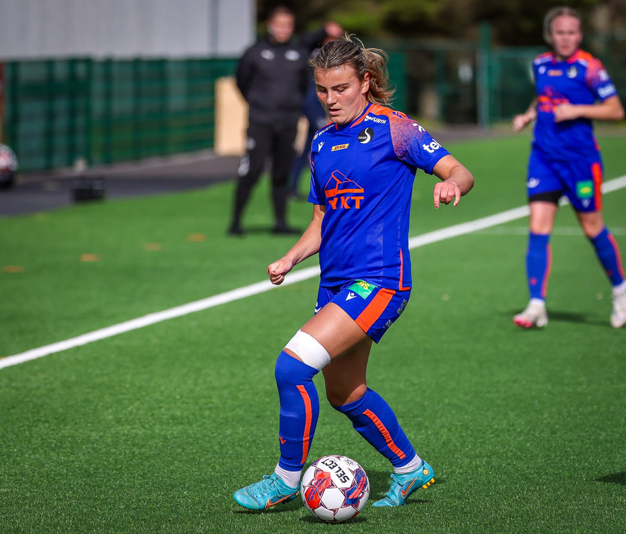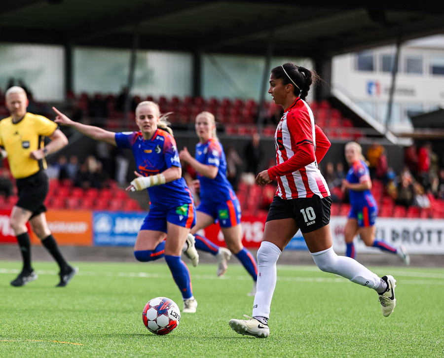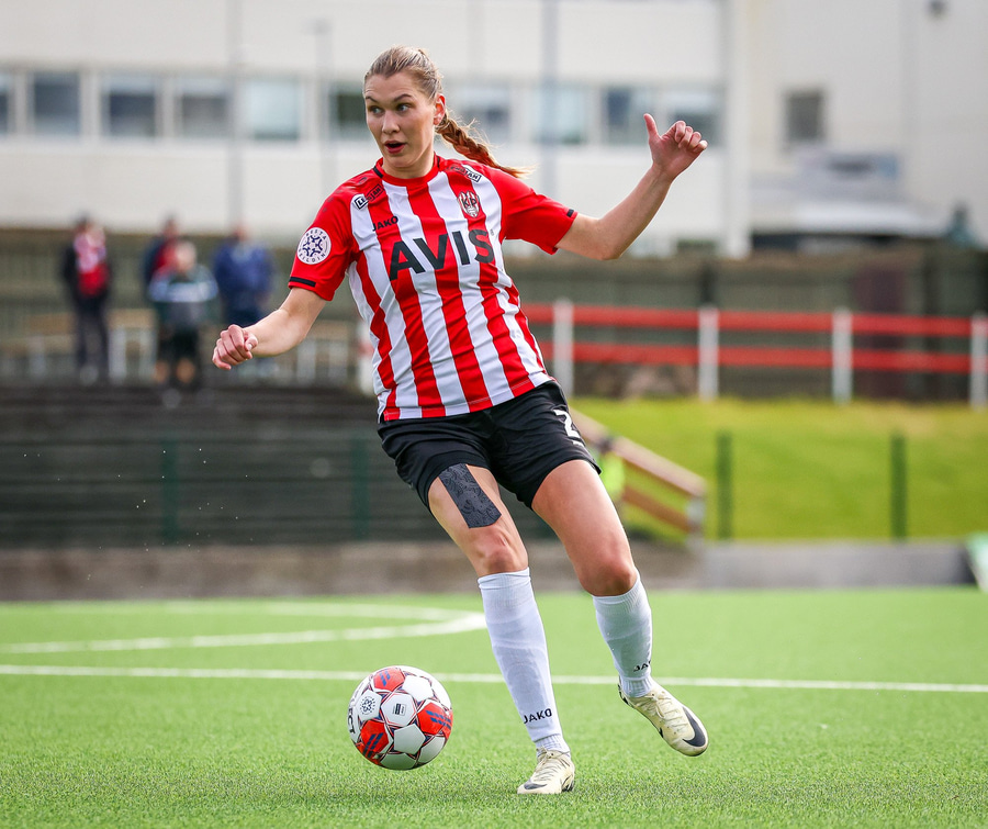 Þórhildur með glæsilegan sprett upp völlinn og kemur boltanum svo út á Evu. Eva er í góðri stöðu inn á teignum og lætur vaða nema skotið fór í hliðarnetið.