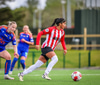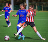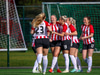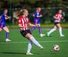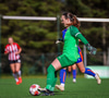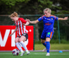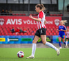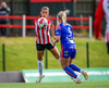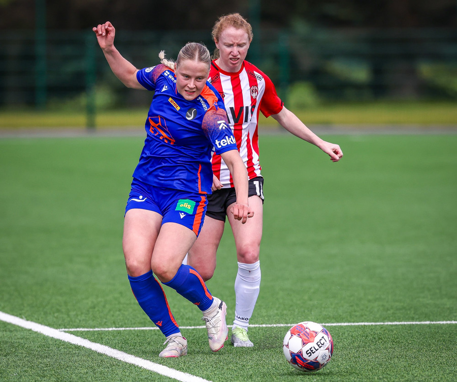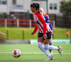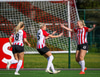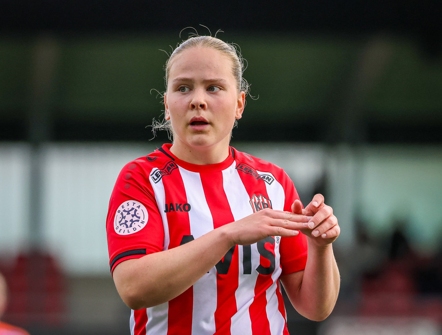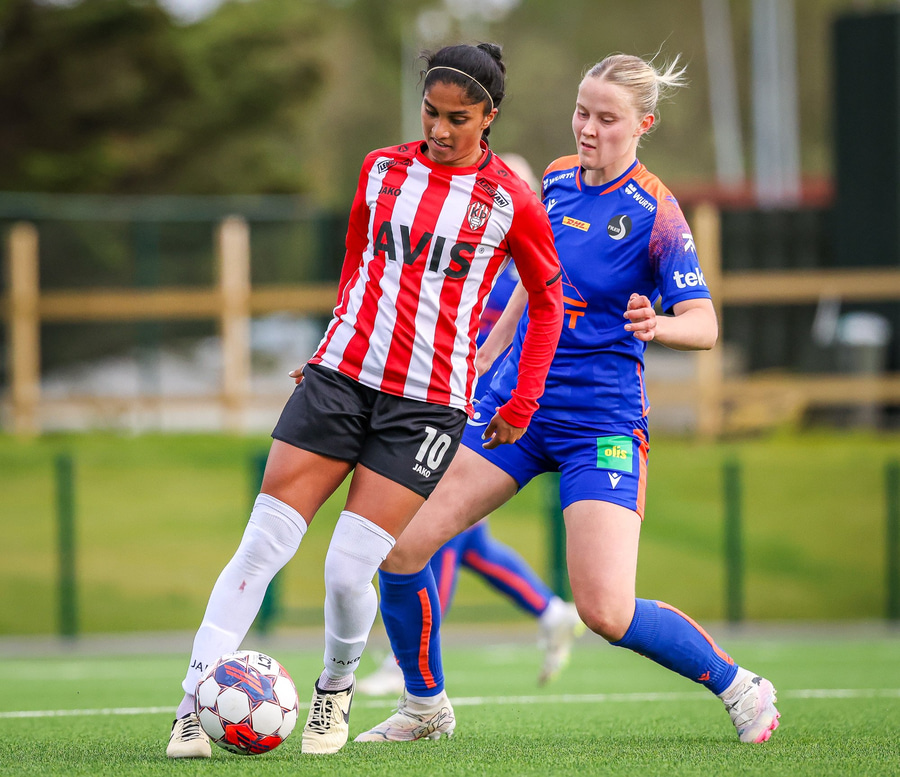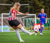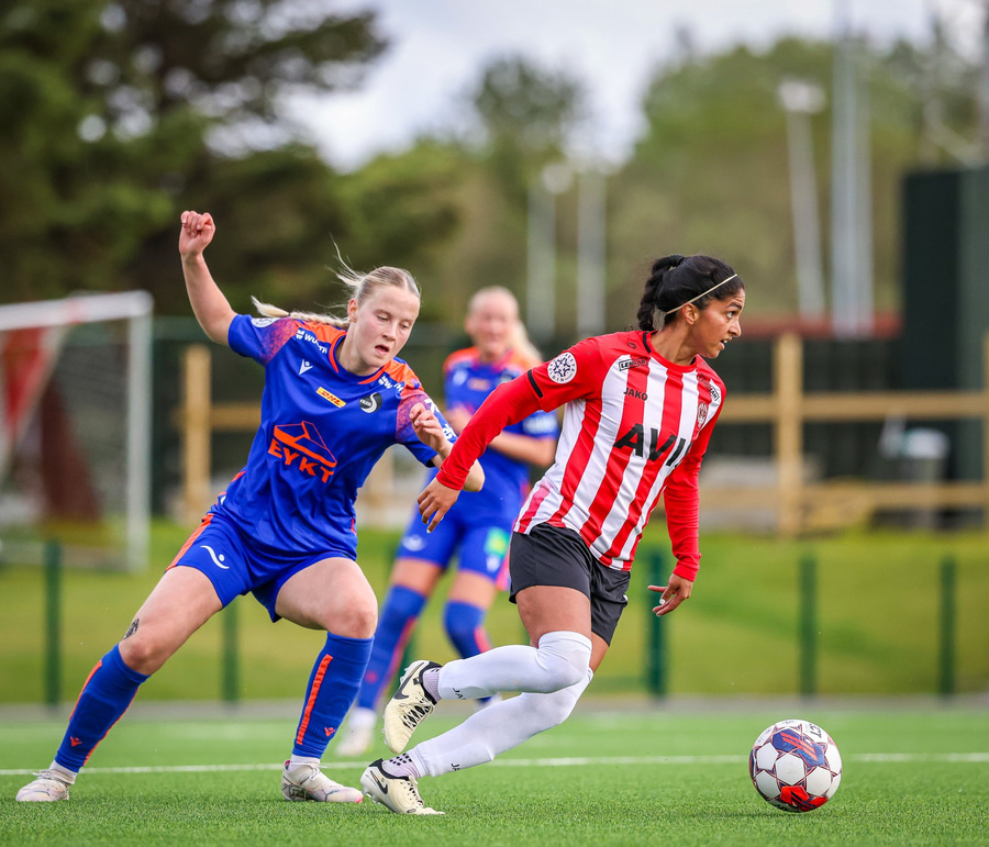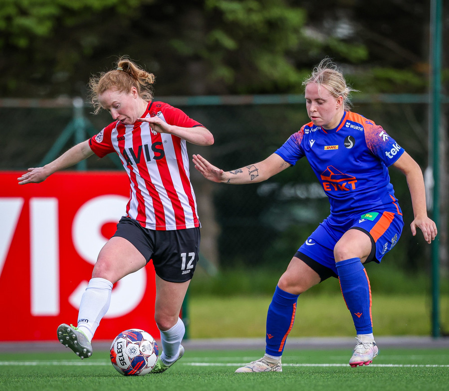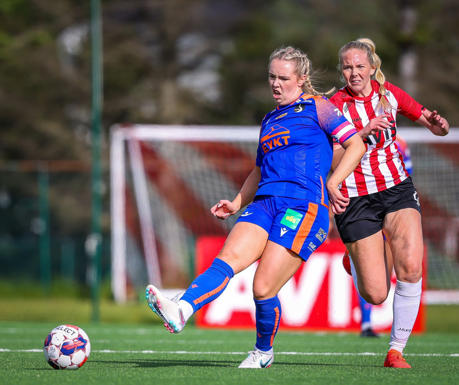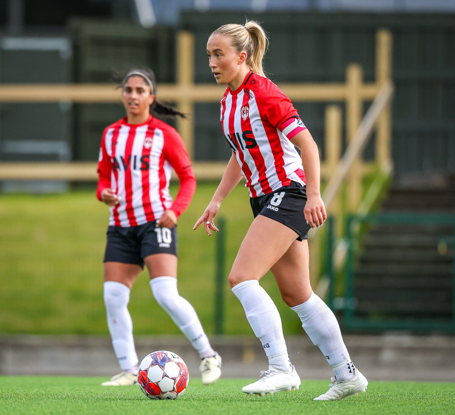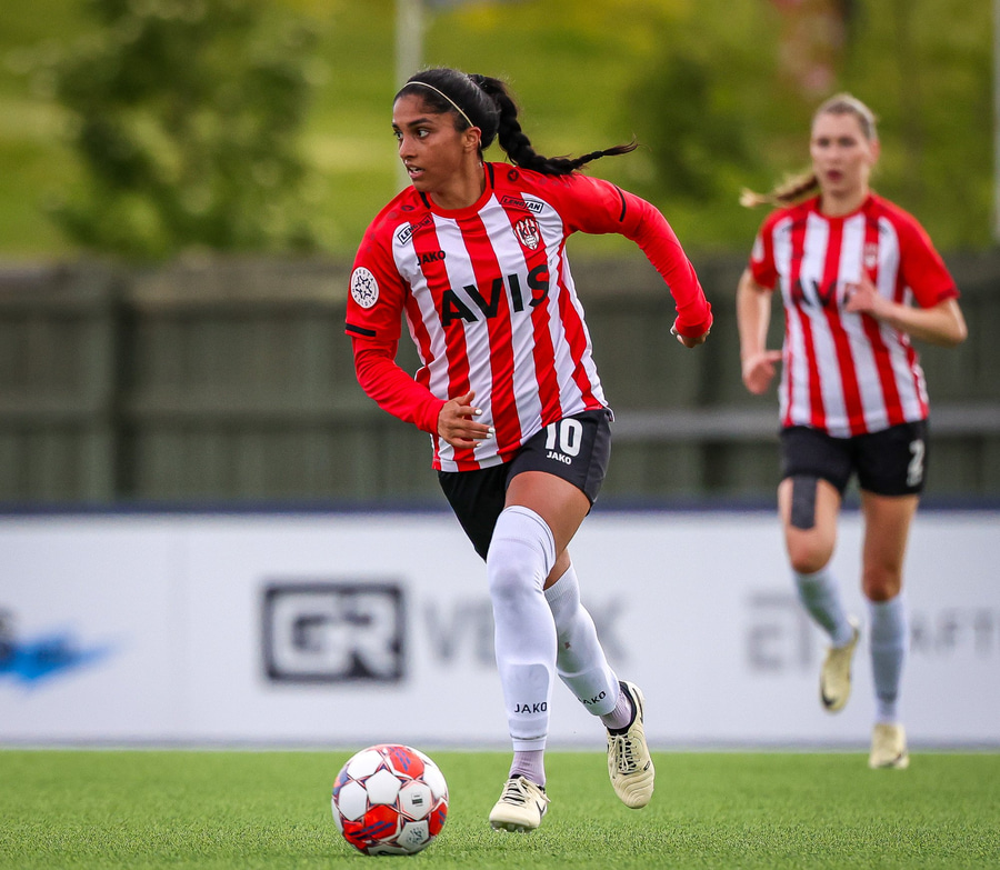 Þórhildur með glæsilegan sprett upp völlinn og kemur boltanum svo út á Evu. Eva er í góðri stöðu inn á teignum og lætur vaða nema skotið fór í hliðarnetið.