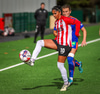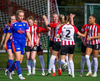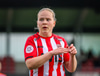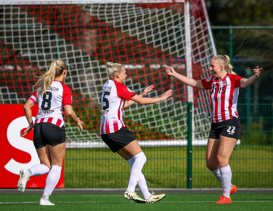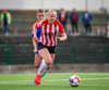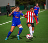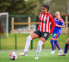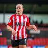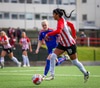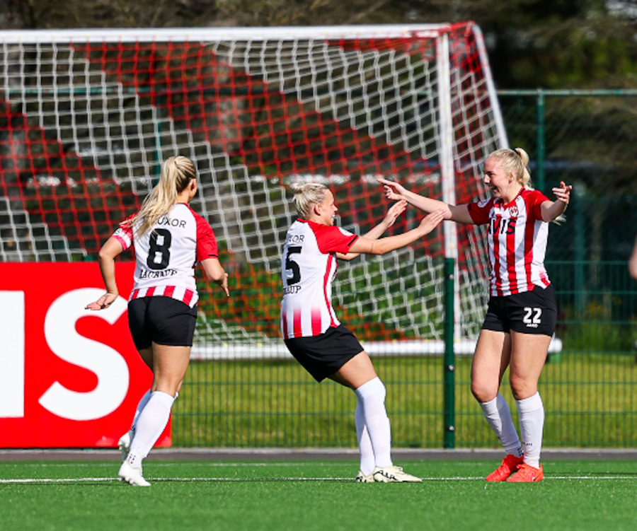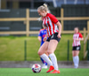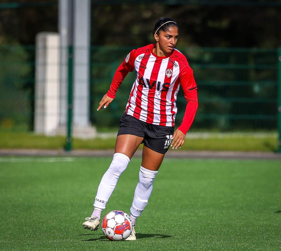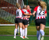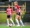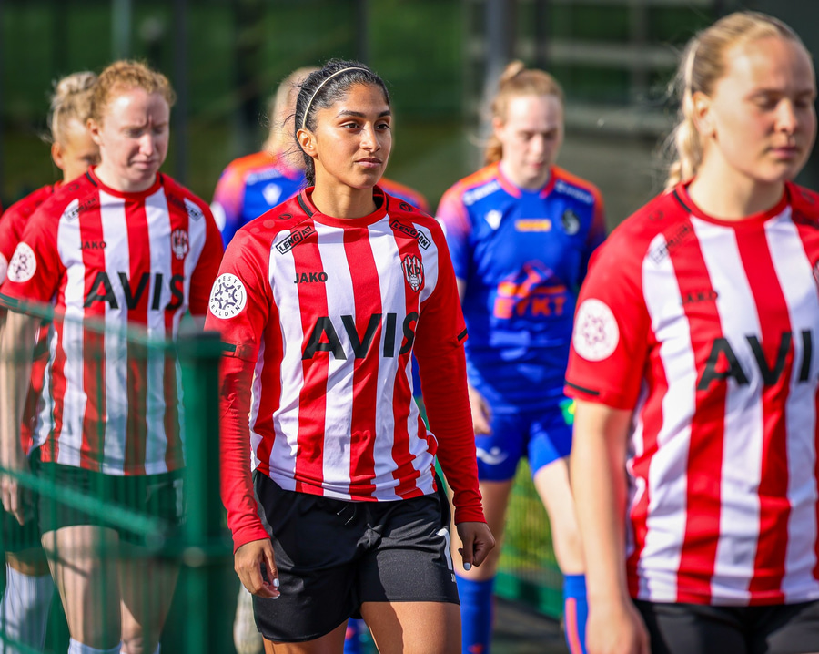 Heimakonur spila í rauðum og hvítum treyjum, svörtum stuttbuxum og hvítum sokkum.