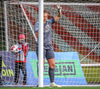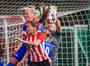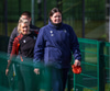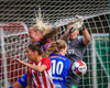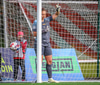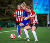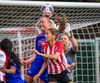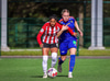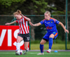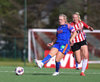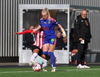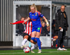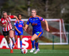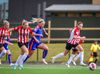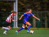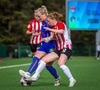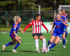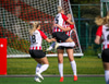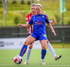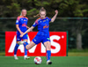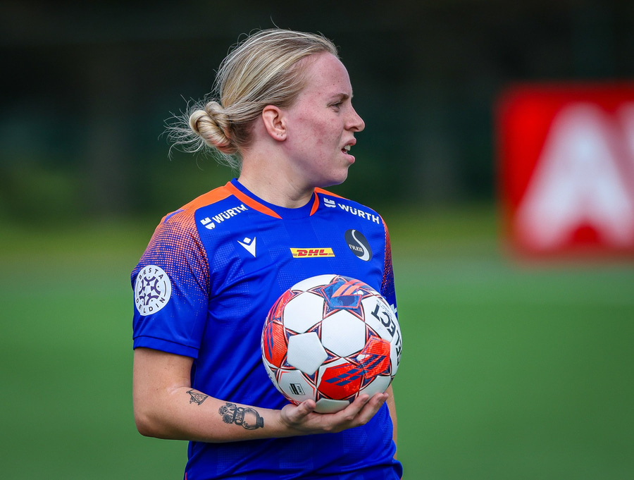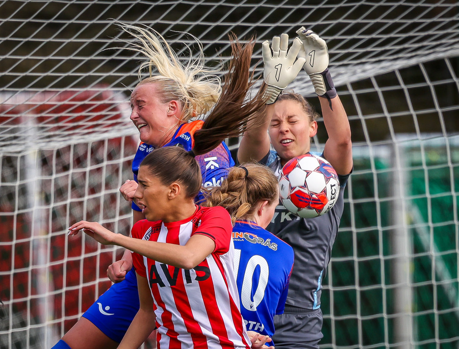 Caroline vinnur boltann ofarlega á vellinum og lætur vaða á markið en Tinna gerir vel og handsamar boltann.