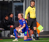 Þórhildur tekur spyrnuna inn á teiginn sem fer á Evu Rut en hún nær ekki að stýra boltanum og missir hann of langt frá sér.