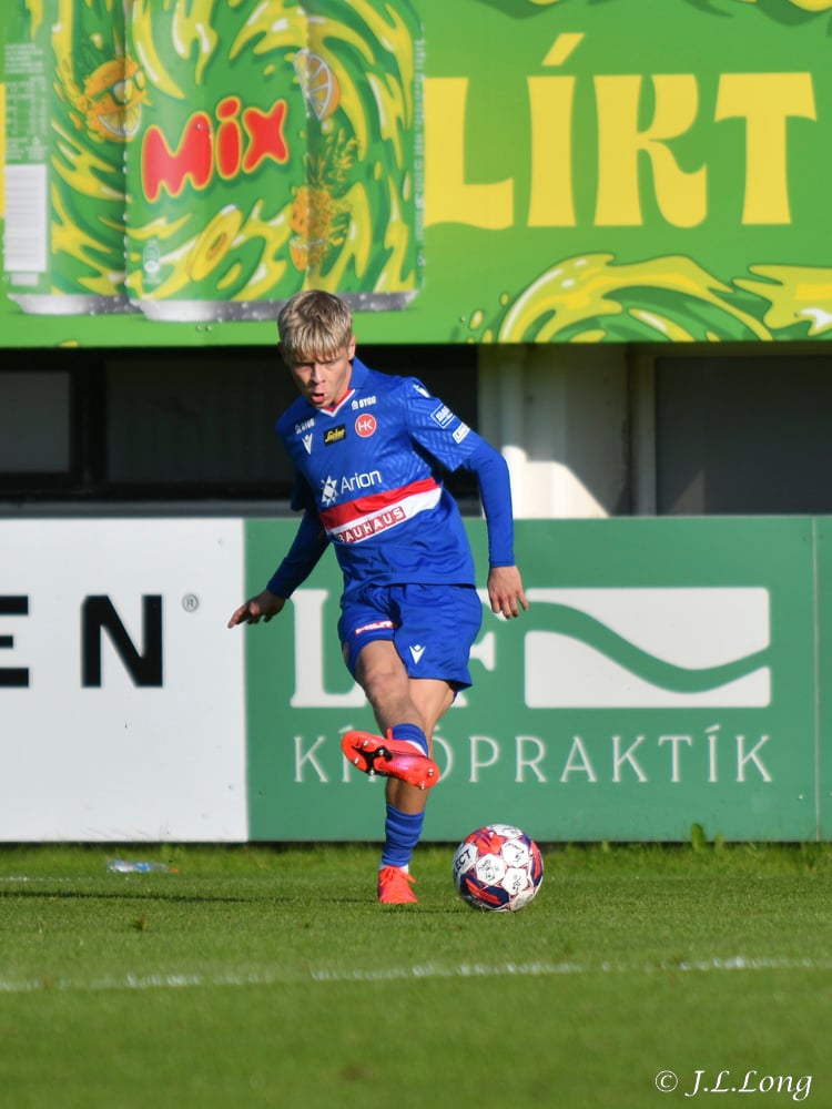 Þetta virkar alltof auðvelt fyrir FH. Þeir vinna boltann við vítateig HK og keyra inn á teig þar sem Böðvar kemur sendingu fyrir markið og Arnór Borg kemur tánni í boltann og Úlfur Ágúst hoppar yfir boltann til að láta hann fara og hann fer í stöngina!