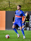 Brýtur á Sigurði Bjart sem er að fara keyra upp í skyndisókn.
