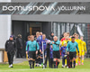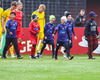 6. flokkur Leiknis labbar með liðunum út á völlinn en þessir efnilegu piltar eru með Heimaklettsbikarinn eftirsótta sem þeir unnu á Orkumótinu í Vestmannaeyjum á dögunum.
