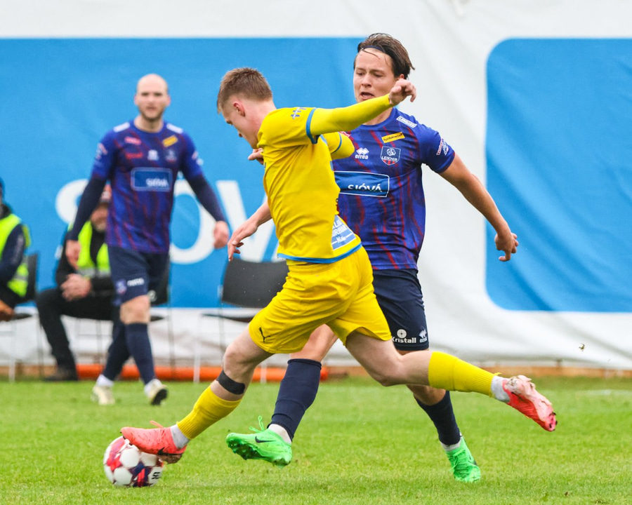 Shkelzen Veseli með flotta tilraun en Halldór Snær í marki Fölnis ver afskaplega vel út við stöngina.