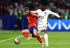 Bellingham tekur geggjaðan snúning, sýnir gæði sín og hristir varnarmenn Spánar af sér áður en hann tekur þéttingsfast skot frá D-boganum. Framhjá.