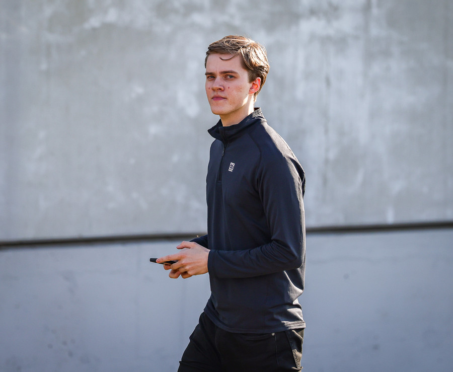 Hinrik fær góða sendingu í gegn frá Arnóri Smára og nær skotinu á markið sem Ólafur er hins vegar í engum vandræðum með og handsamar boltann.