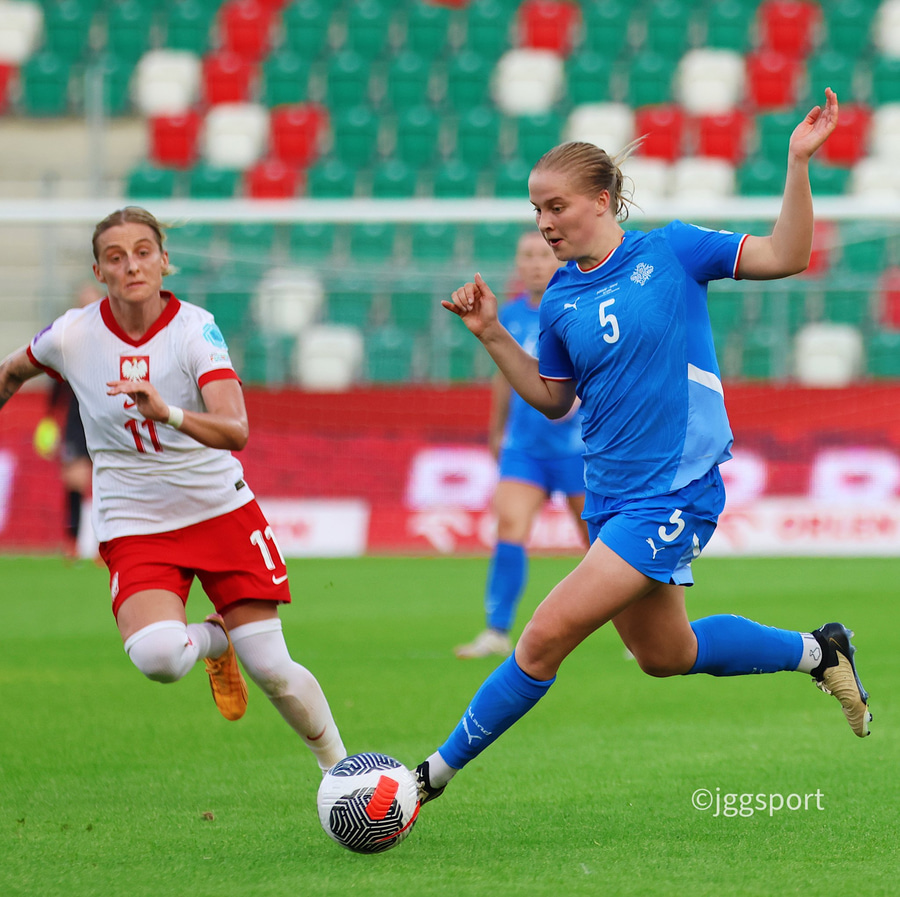 Glódís nær ekki að vinna fyrsta boltann og pólska liðið skallar frá.