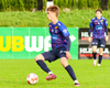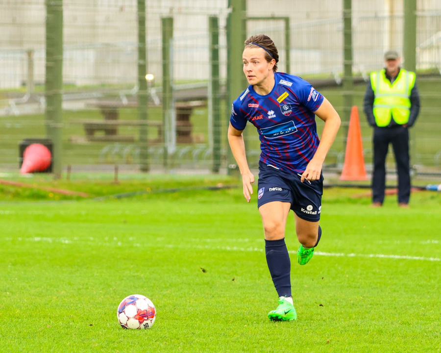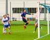 Hákon með fyrirgjöf af hægri kantinum á Guðjón sem stendur ein í teignum og hoppar upp til þess að skalla boltann en skallinn ekki nægilega góður.