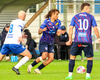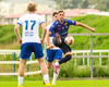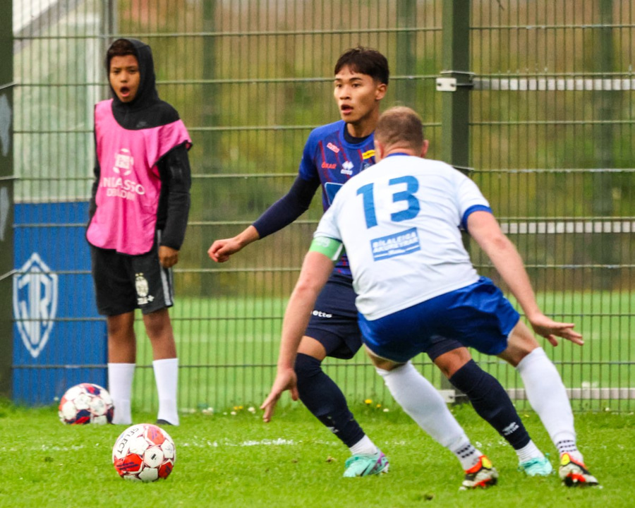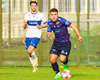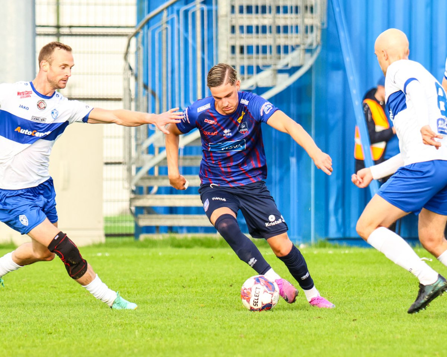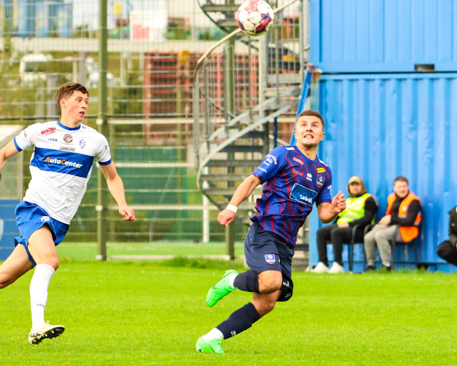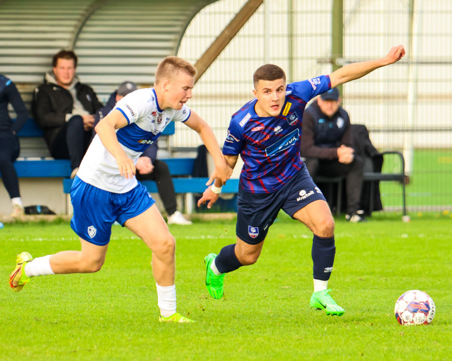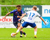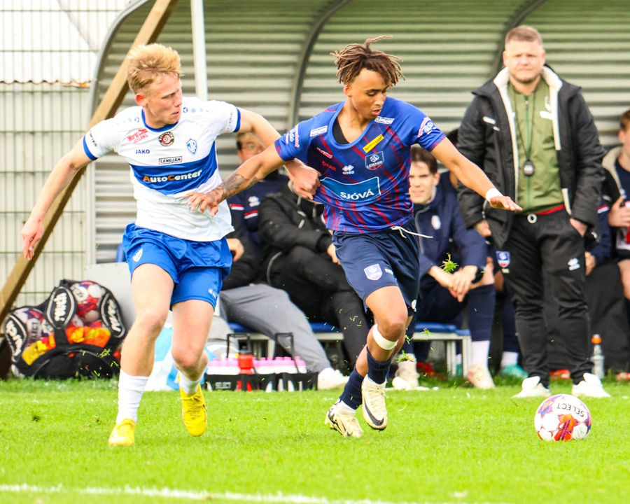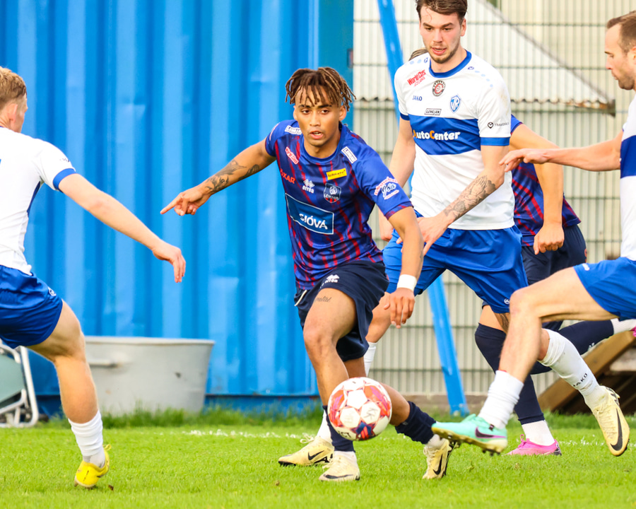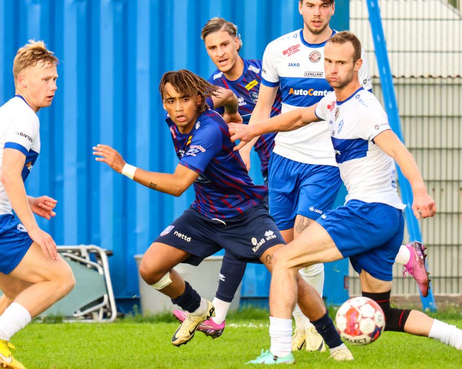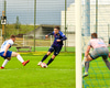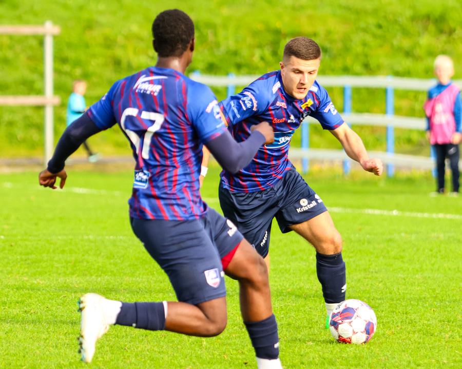 Marko reynir að þræða boltann í gegn á Shkelzen sem er á harðaspretti. Shkelzen rétt missir af boltanum.