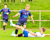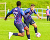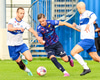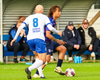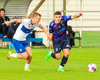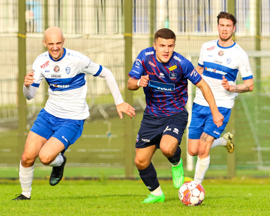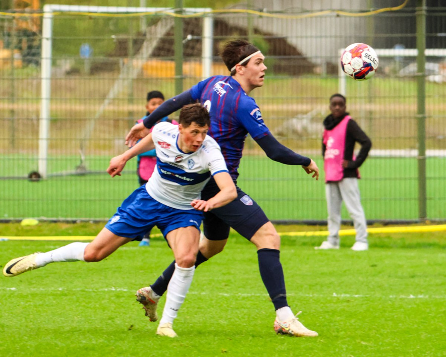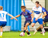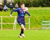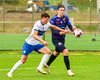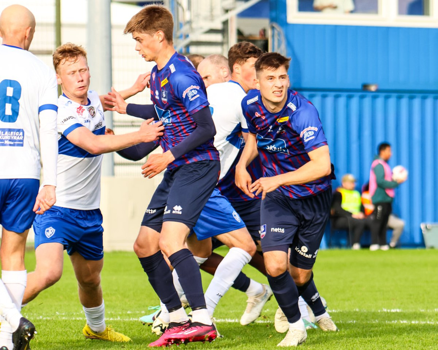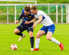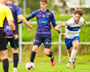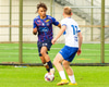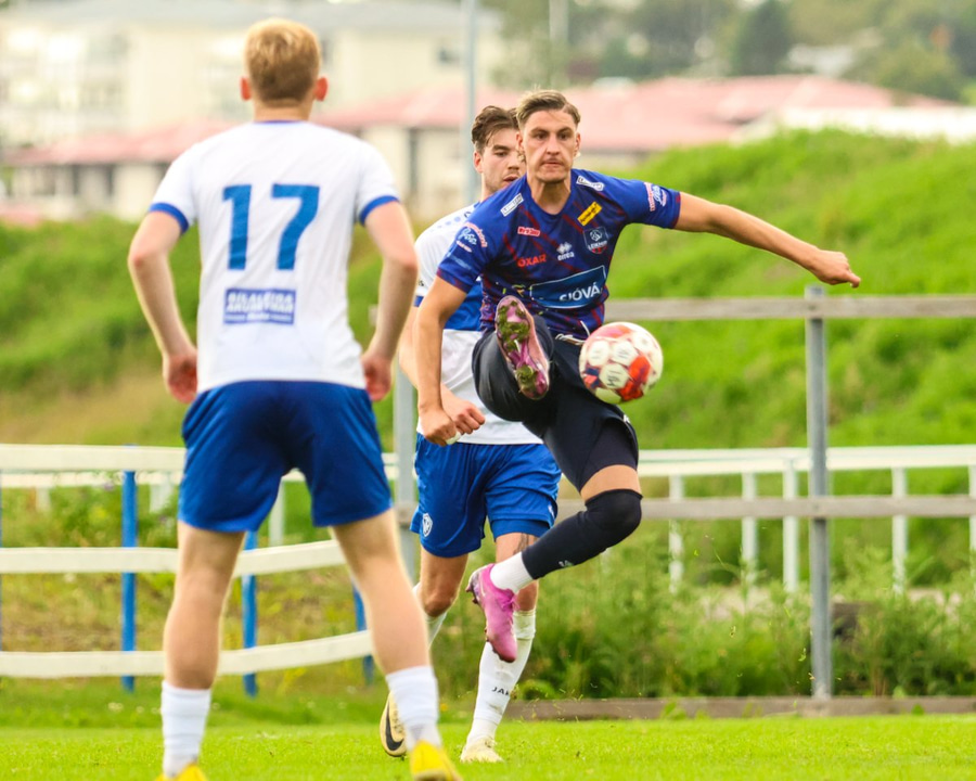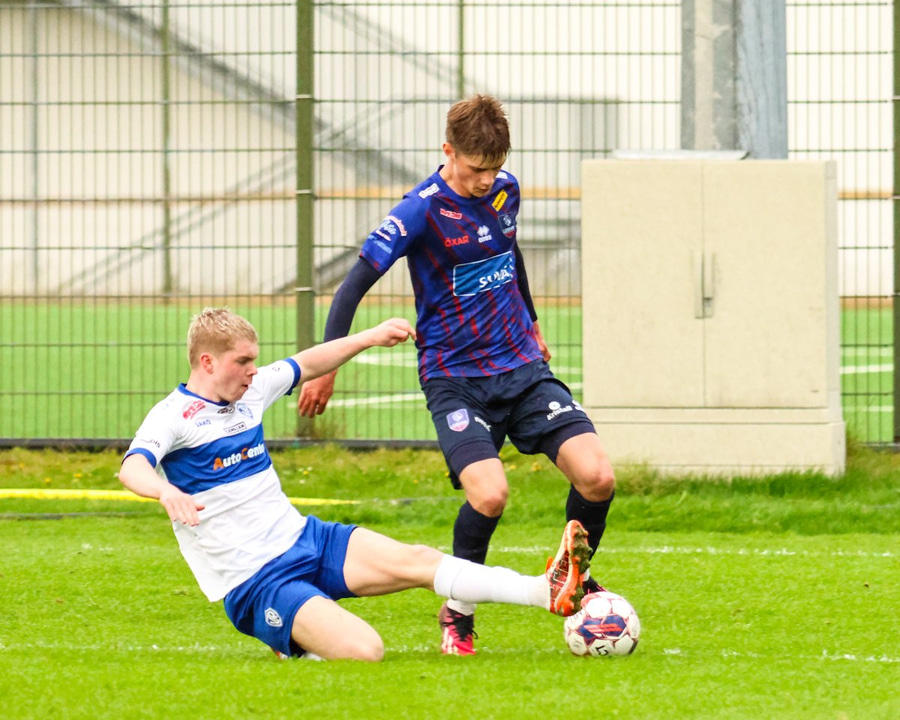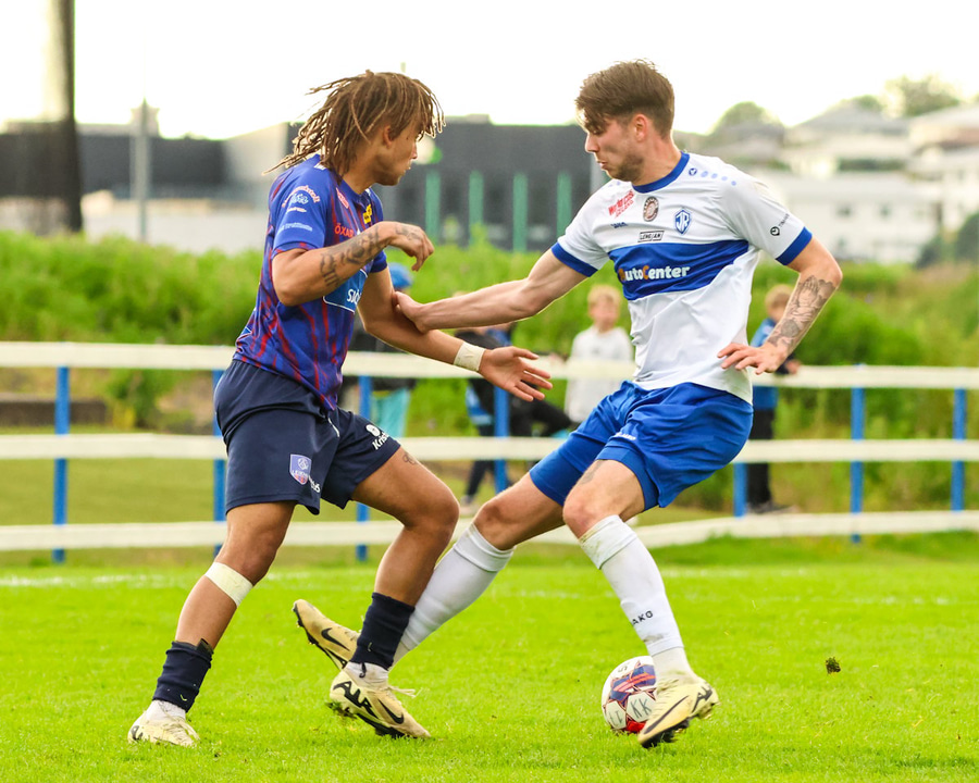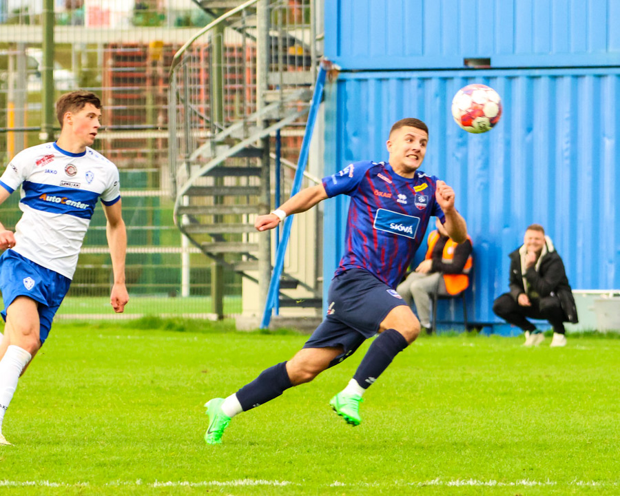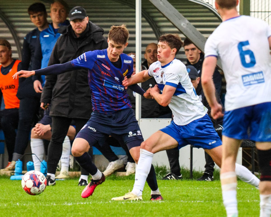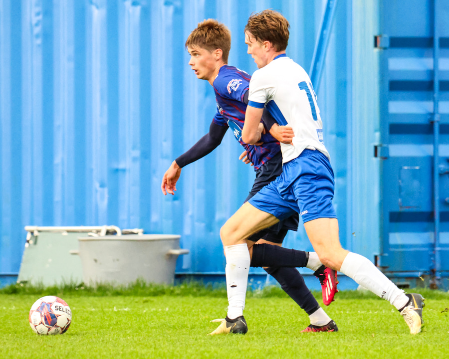 Vilhelm aðeins að leggja sér að eldinum þegar hann hikar eitthvað þegar hann ætlar að senda boltann. Róbert Hauks kemur á fleygiferð og er næstum því búinn að ná boltanum af honum.
