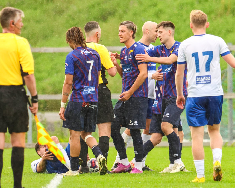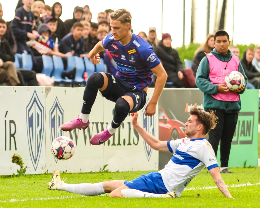 Guðjón brýtur á Róberti Quental hægra megin á vellinum í ágætis fyrirgjafarstöðu.