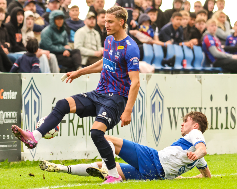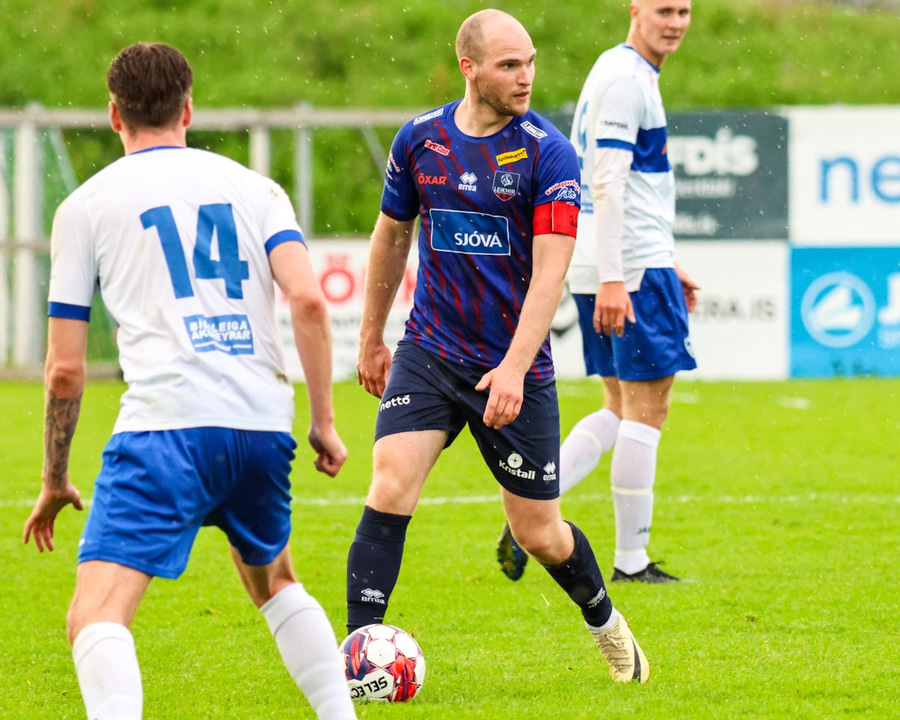 Hjalti sækir aukaspyrnu fyrir Leikni í mjög góðri fyrirgjafarstöðu vinstra megin á vellinum.