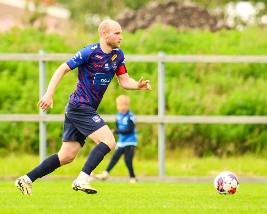 Blokkerar Guðjón sem var að komast framhjá honum.