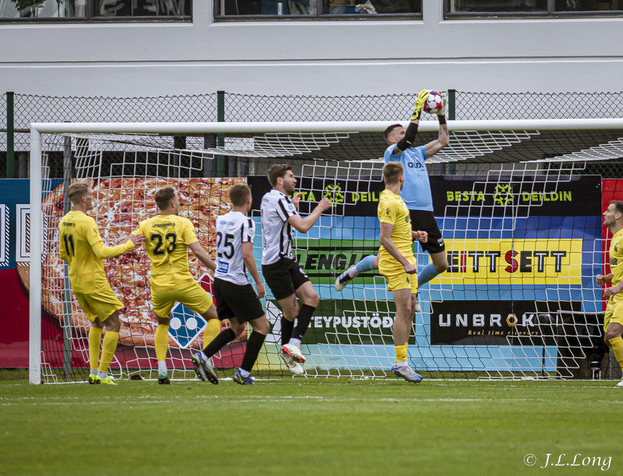 Benoný Breki er þá sloppinn einn í gegn og er við það að fara að láta vaða á markið þegar Arngrímur mætir á svæðið og tæklar boltann aftur fyrir í hornspyrnu.